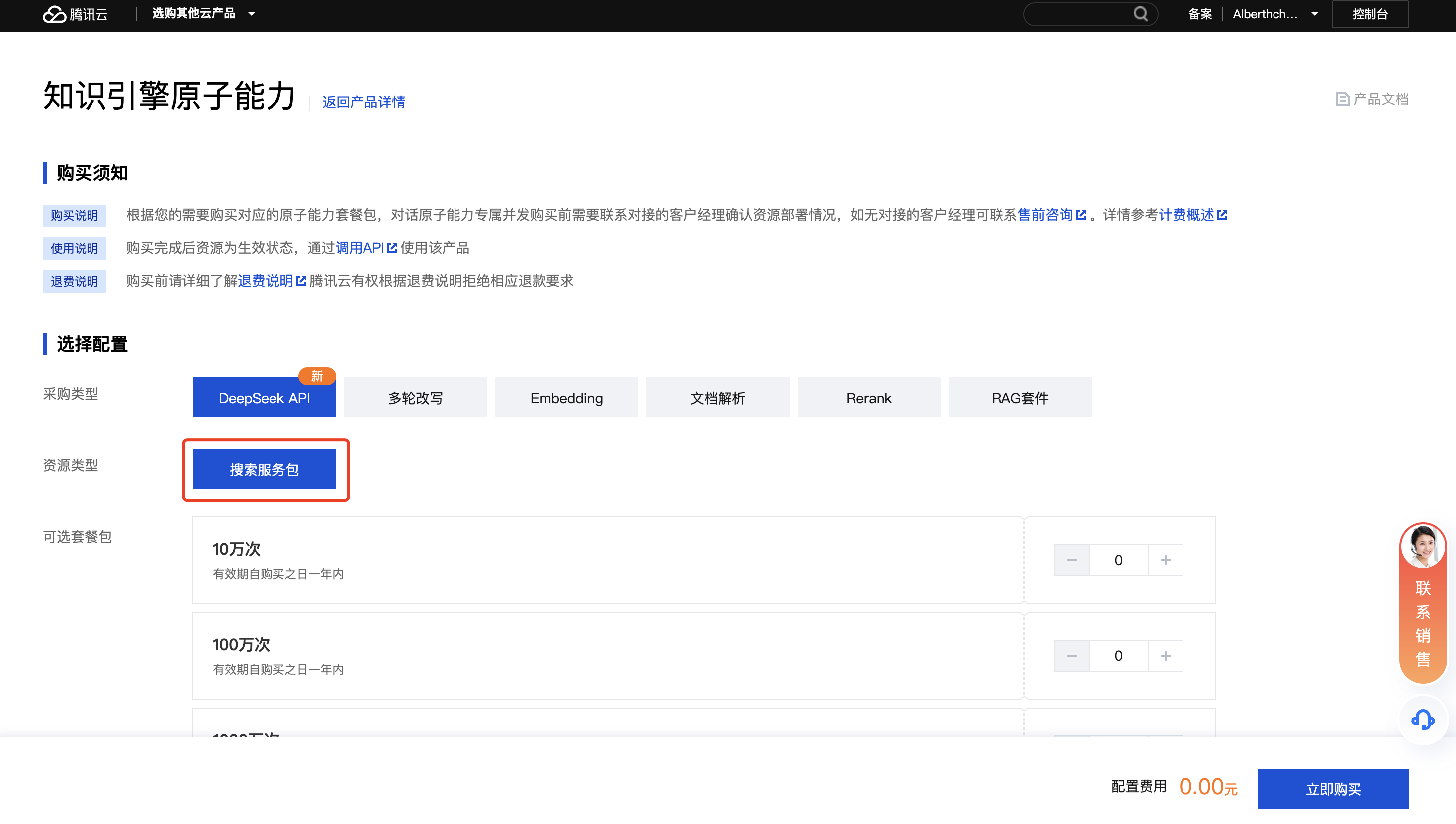 2. 进入 原子能力控制台 打开联网搜索后付费开关或者购买搜索服务的资源包。