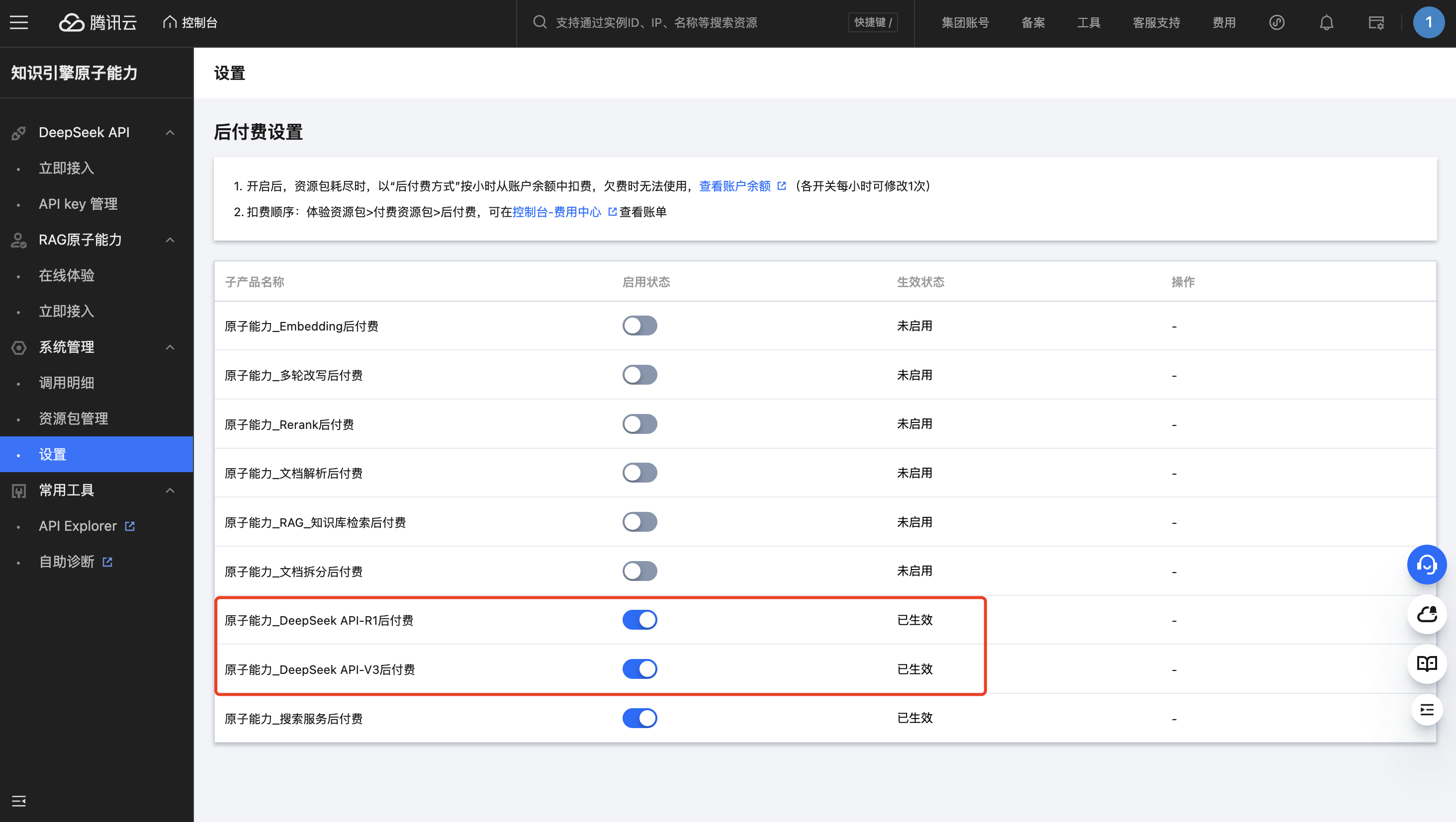 1. 首先开启 DeepSeek API 的服务,进入 原子能力控制台 开启 DeepSeek 的后付费开关。