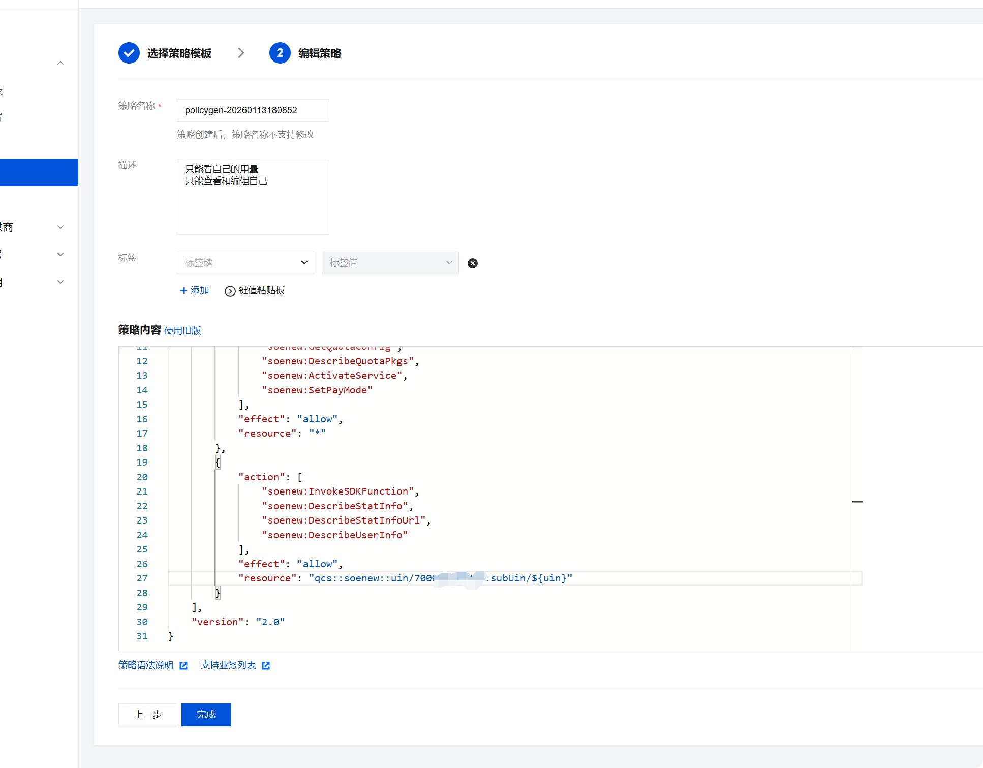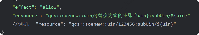 {"statement": [{"action": ["soenew:DescribeOpenStatus","soenew:GetQpsStatistics","soenew:GetQpsStatisticsUrl","soenew:DescribePidOrders","soenew:GetQpsQuota","soenew:GetQuotaConfig","soenew:DescribeQuotaPkgs","soenew:ActivateService","soenew:SetPayMode"],"effect": "allow","resource": "*"},{"action": ["soenew:InvokeSDKFunction","soenew:DescribeStatInfo","soenew:DescribeStatInfoUrl","soenew:DescribeUserInfo"],"effect": "allow","resource": "qcs::soenew::uin/{替换为您的主账户uin}:subUin/${uin}"//例如:"resource": "qcs::soenew::uin/123456:subUin/${uin}"}],"version": "2.0"}