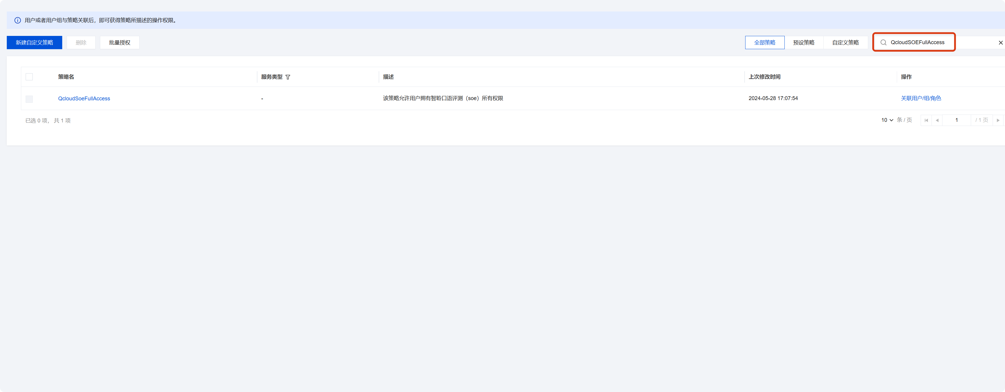 可用预设策略:QcloudSOEFullAccess 并关联/授权所有用户。