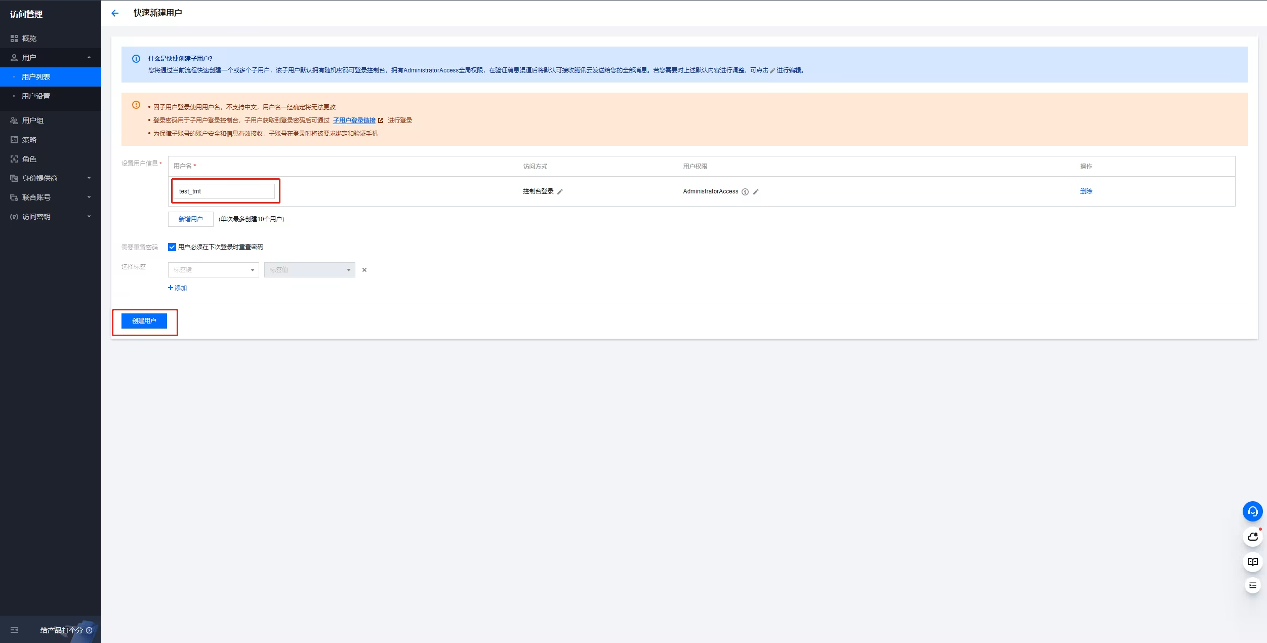 1. 填写用户名,单击创建用户完成创建。