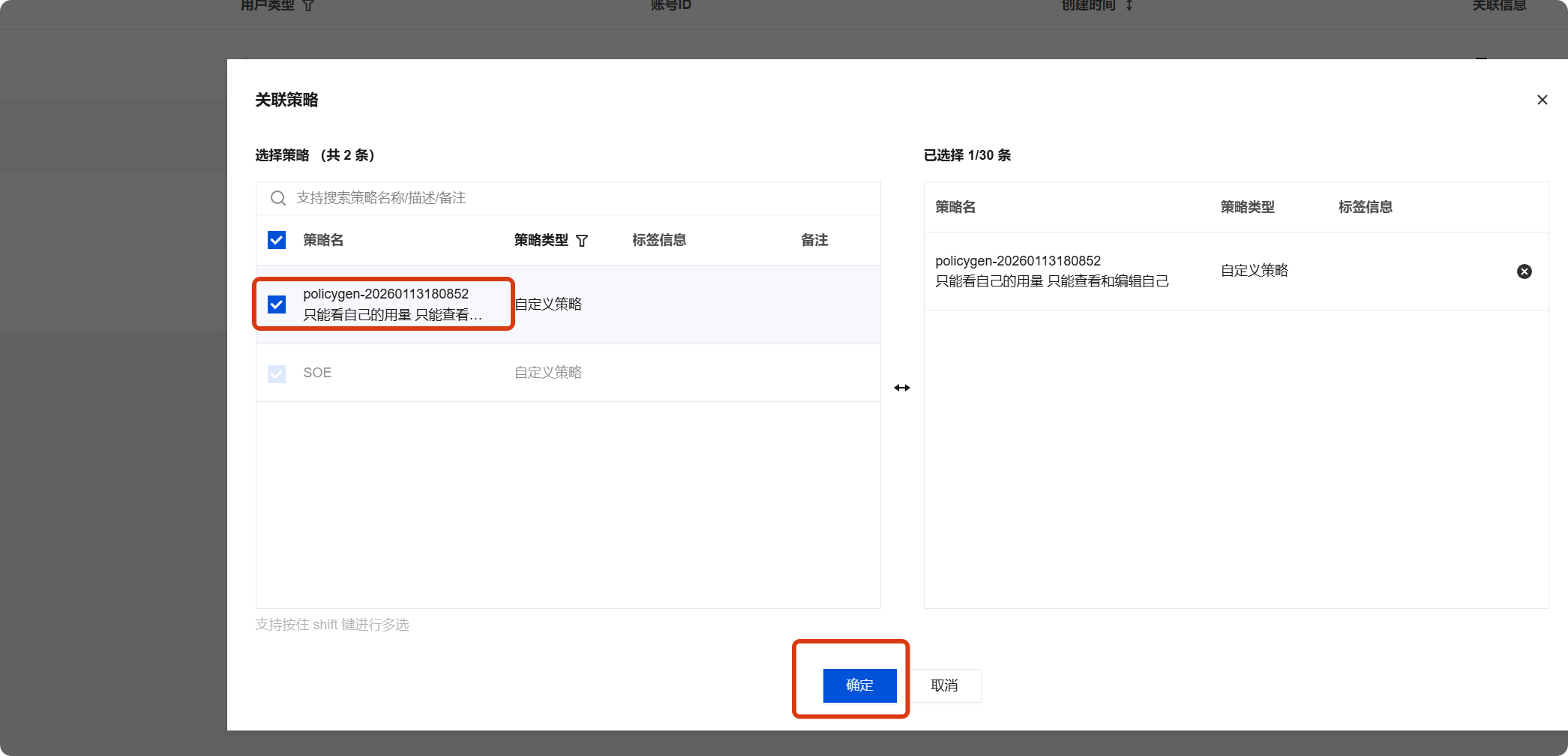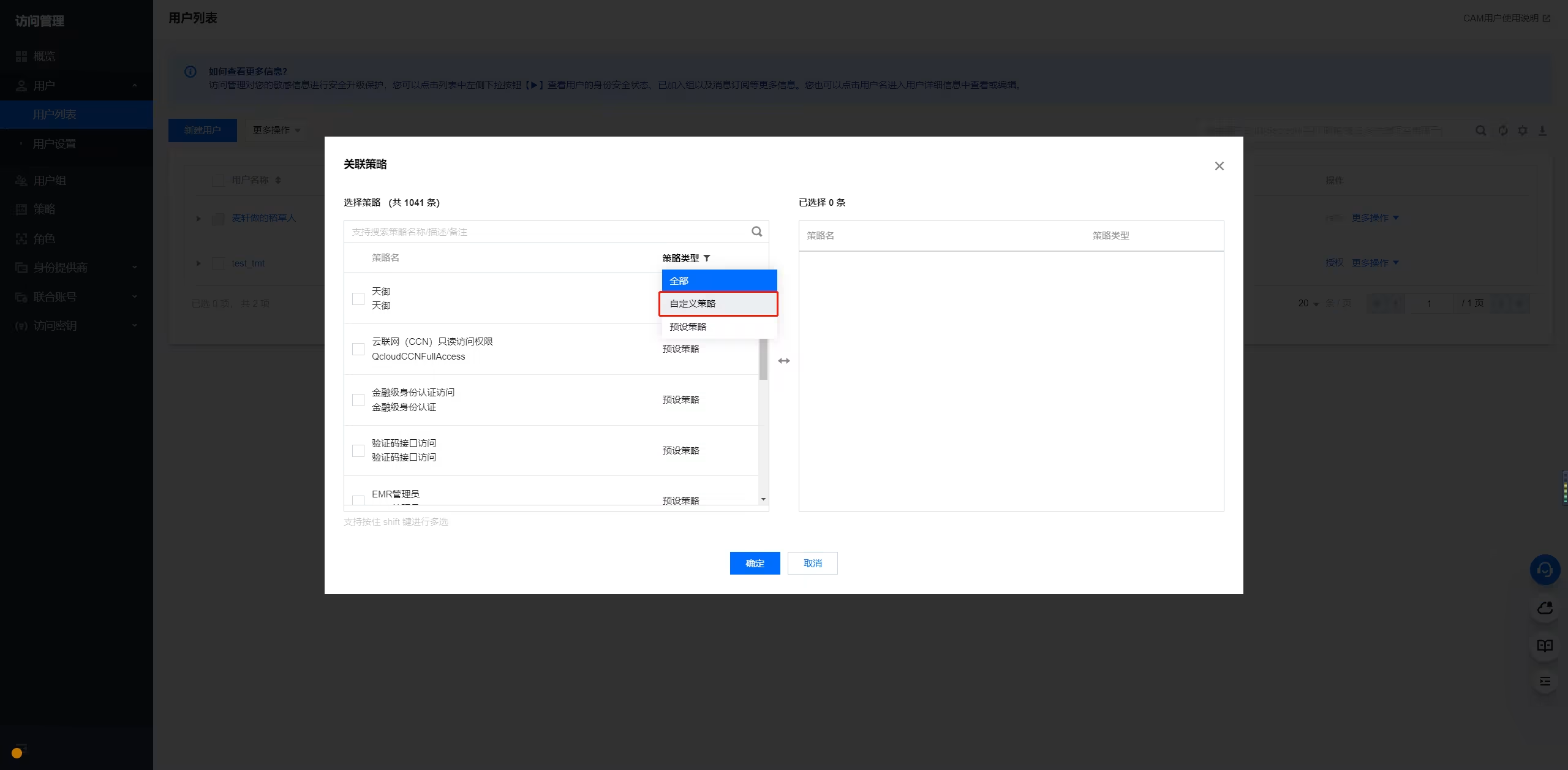 3. 选择此前配置好的自定义策略,单击确定完成策略授予。