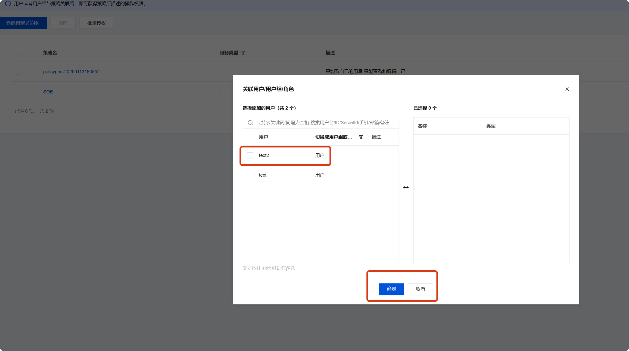 2. 选择需要授权的用户/用户组/角色,单击确定完成策略关联。
