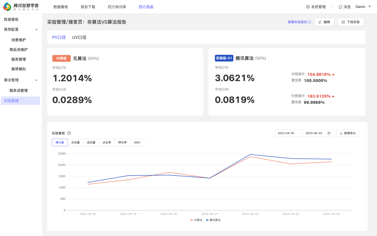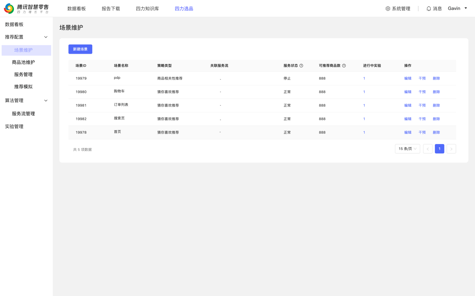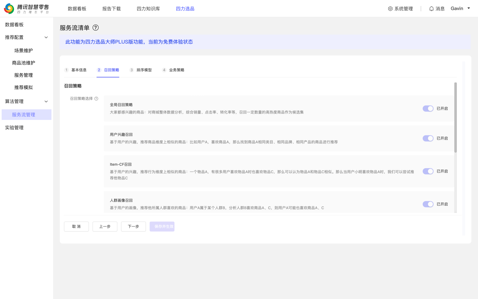 本产品功能页面共包含四大模块:数据看板、推荐配置、算法管理、实验管理。本产品模块承载于腾讯智慧零售四力商家增长平台页面上,用户登录平台后,可以选择四力选品界面(“四力”指“组织力”、“运营力”、“商品力”、“产品力”,以下简称“本产品界面”)进行推荐各项配置并查看实验效果数据。
