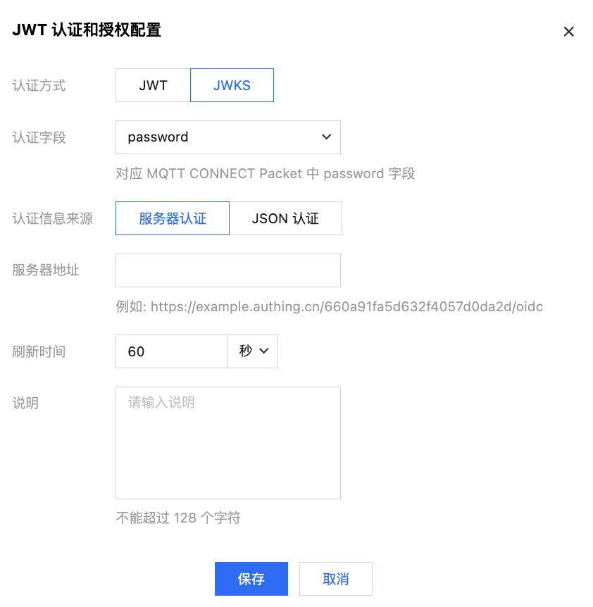 服务器认证:JWKS 服务器指 MQTT 服务端动态从指定的地址获取公钥集合,因此您除了填写 JWKS 服务器地址之外,还需要填写定期从服务器获取公钥集合的时间。