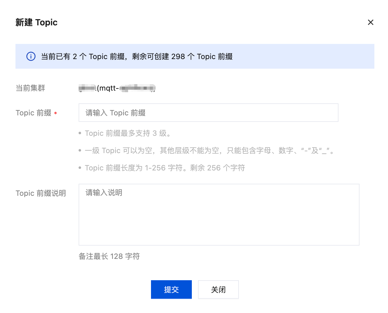 Topic 前缀 | Topic 前缀最多支持 3 级。 一级 Topic 可以为空,其他层级不能为空,只能包含字母、数字、“-”及“_”。 Topic 前缀长度为 1-256 字符。 |