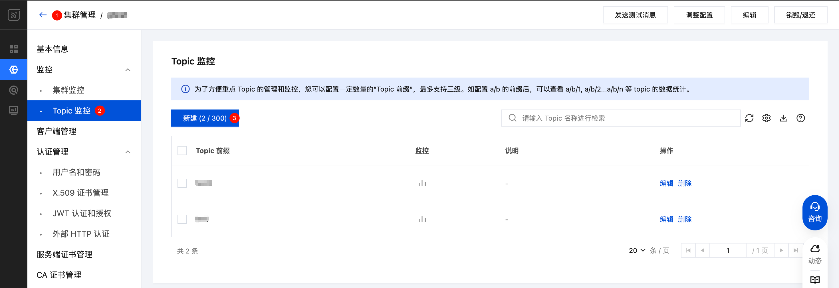 为了方便重点 Topic 的管理和监控,您可以在控制台配置一定数量的“Topic 前缀”,最多支持三级。如配置 a/b 的前缀后,可以查看 a/b/1, a/b/2...a/b/n 等 Topic 的数据统计。