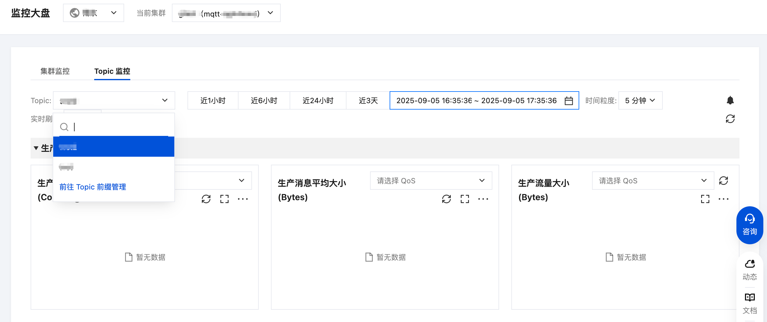 3. 选择 Topic 监控页签,在下拉框中选择您要查看的 Topic 前缀,设置好时间范围,可以查看 Topic 的监控数据。
