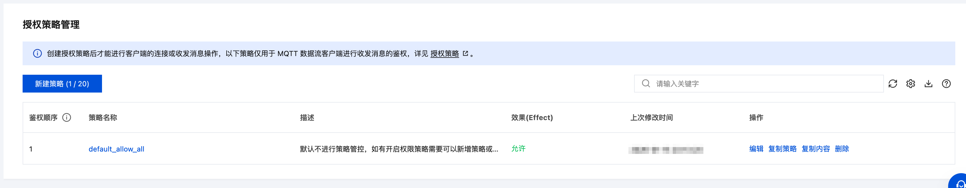 MQTT 实例默认提供基于数据库的策略存储源,可通过控制台或者云 API 定义、更新、排序、删除策略。策略修改变更定期同步到 MQTT 节点后生效。