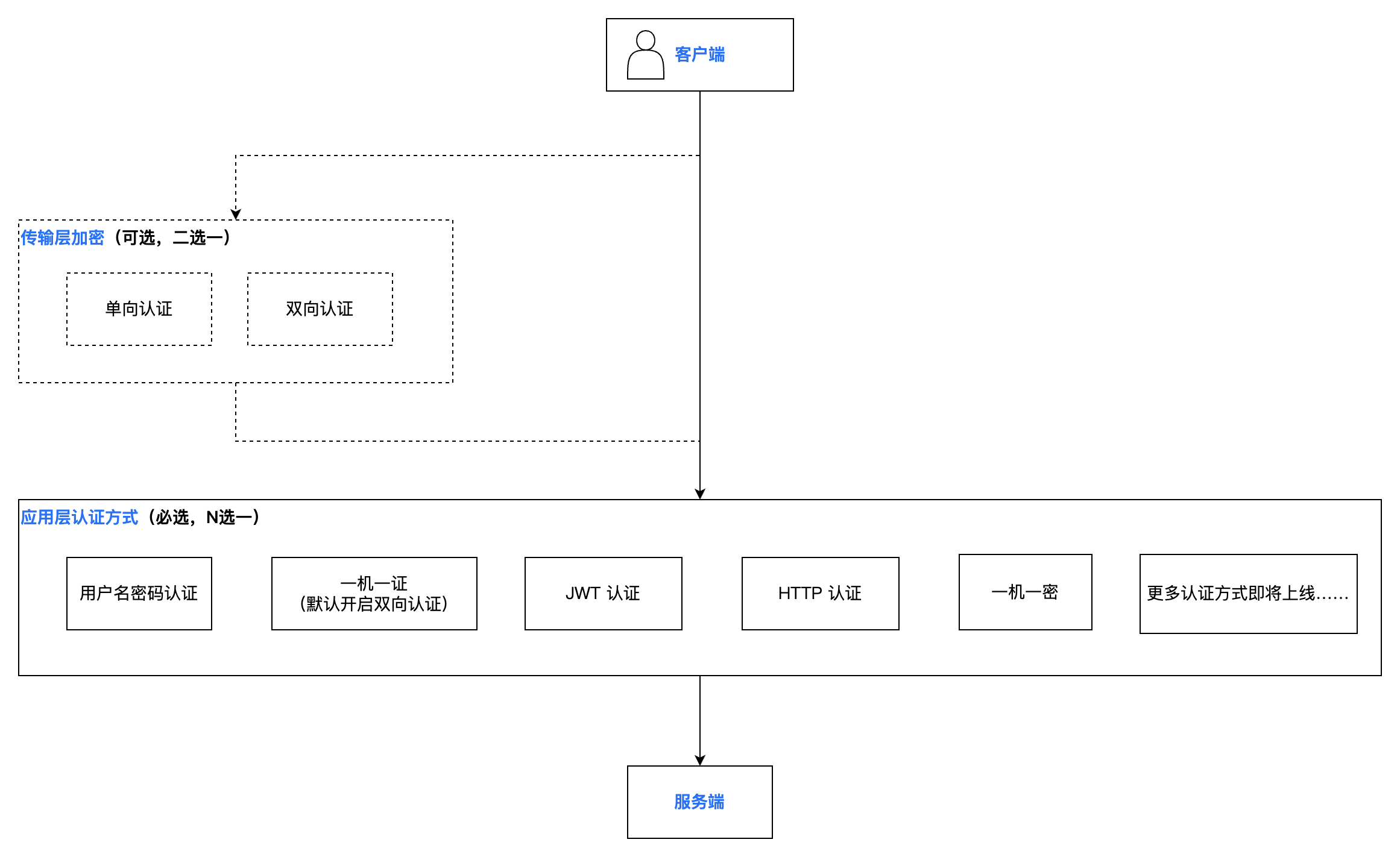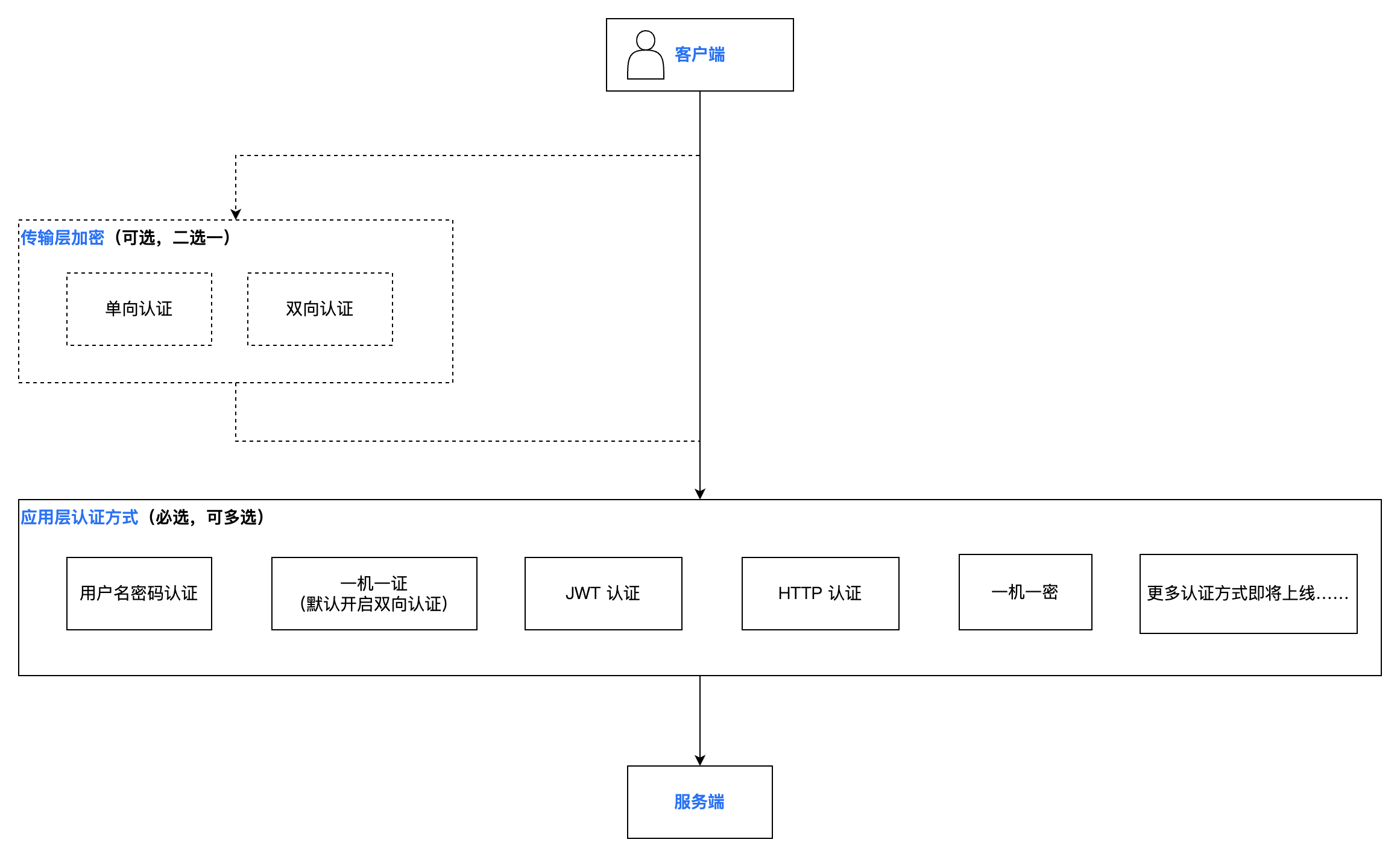 X.509 证书认证 | 单向认证:由客户端认证服务端,客户端对服务端的认证通过服务端证书完成。服务端会使用您选择的证书和客户端建联。 | ✓ | ✓ | ✓ | 对安全性要求一般,或者测试场景。 |
