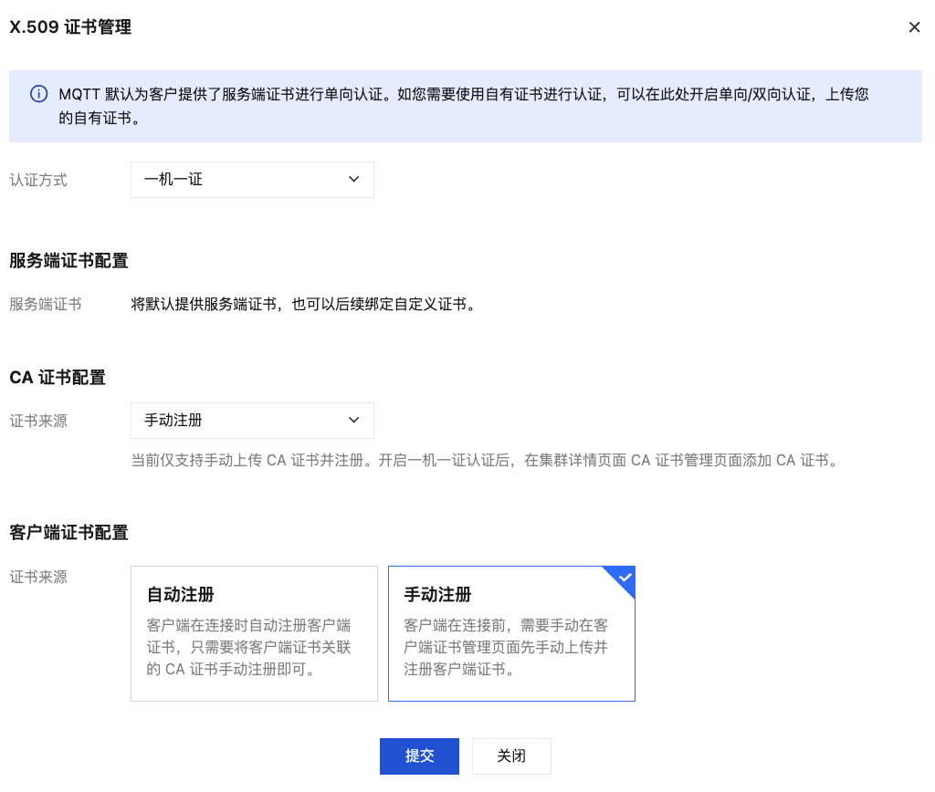 手动注册:客户端在连接前,需要手动在客户端证书管理页面先手动上传并注册客户端证书。手动注册客户端证书的操作步骤请参考管理客户端证书。