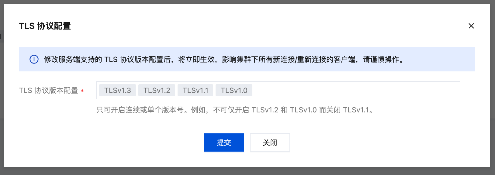 修改服务端支持的 TLS 协议版本配置后,将立即生效,影响集群下所有新连接/重新连接的客户端,请谨慎操作。