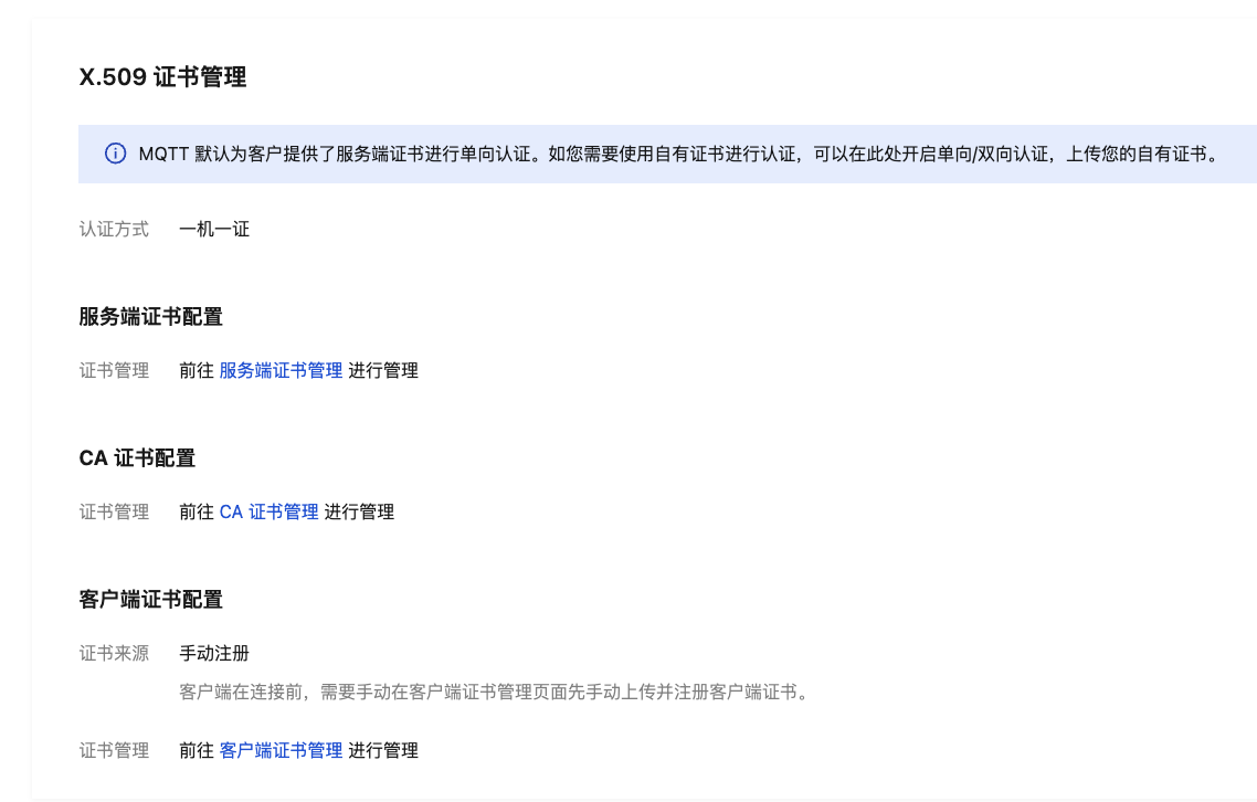 服务端证书配置:可以使用 MQTT 提供的默认服务端证书,也可以后续绑定自定义证书。