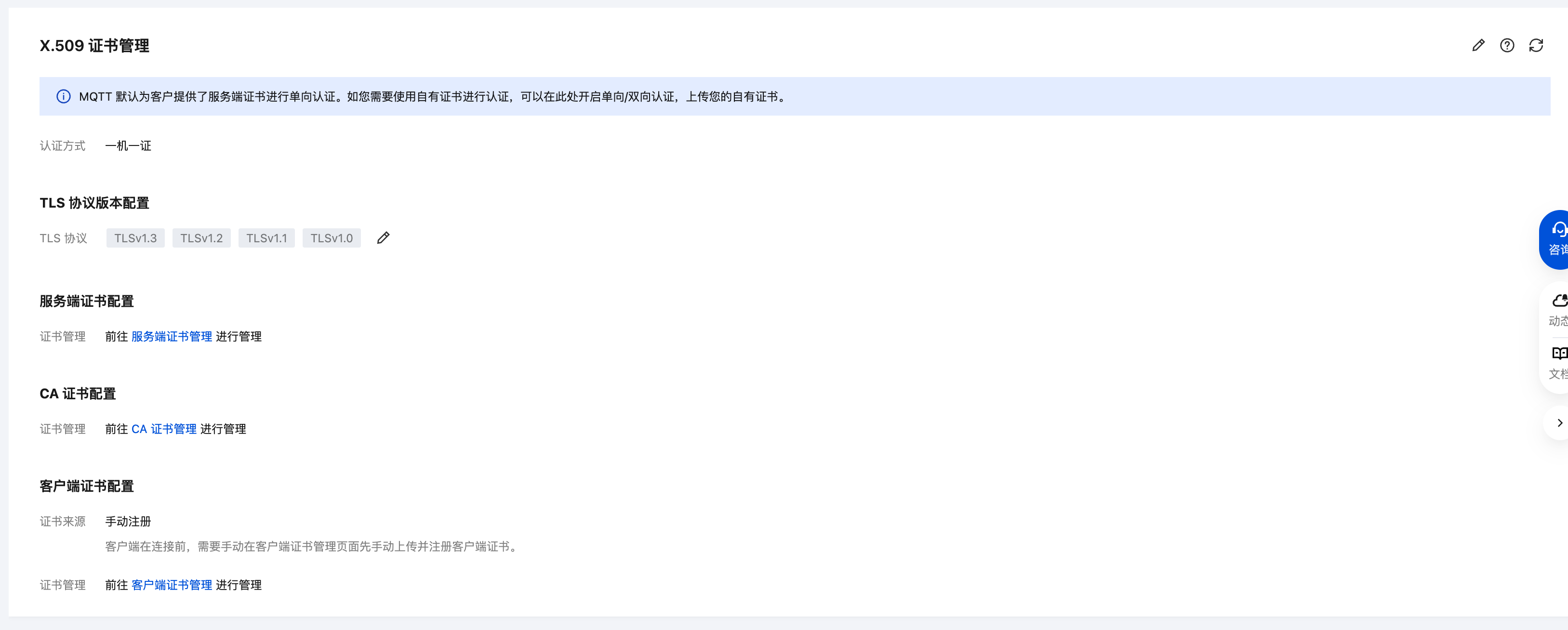 3. 在认证管理页面,进入 X.509 证书管理页签,单击右侧的编辑图标