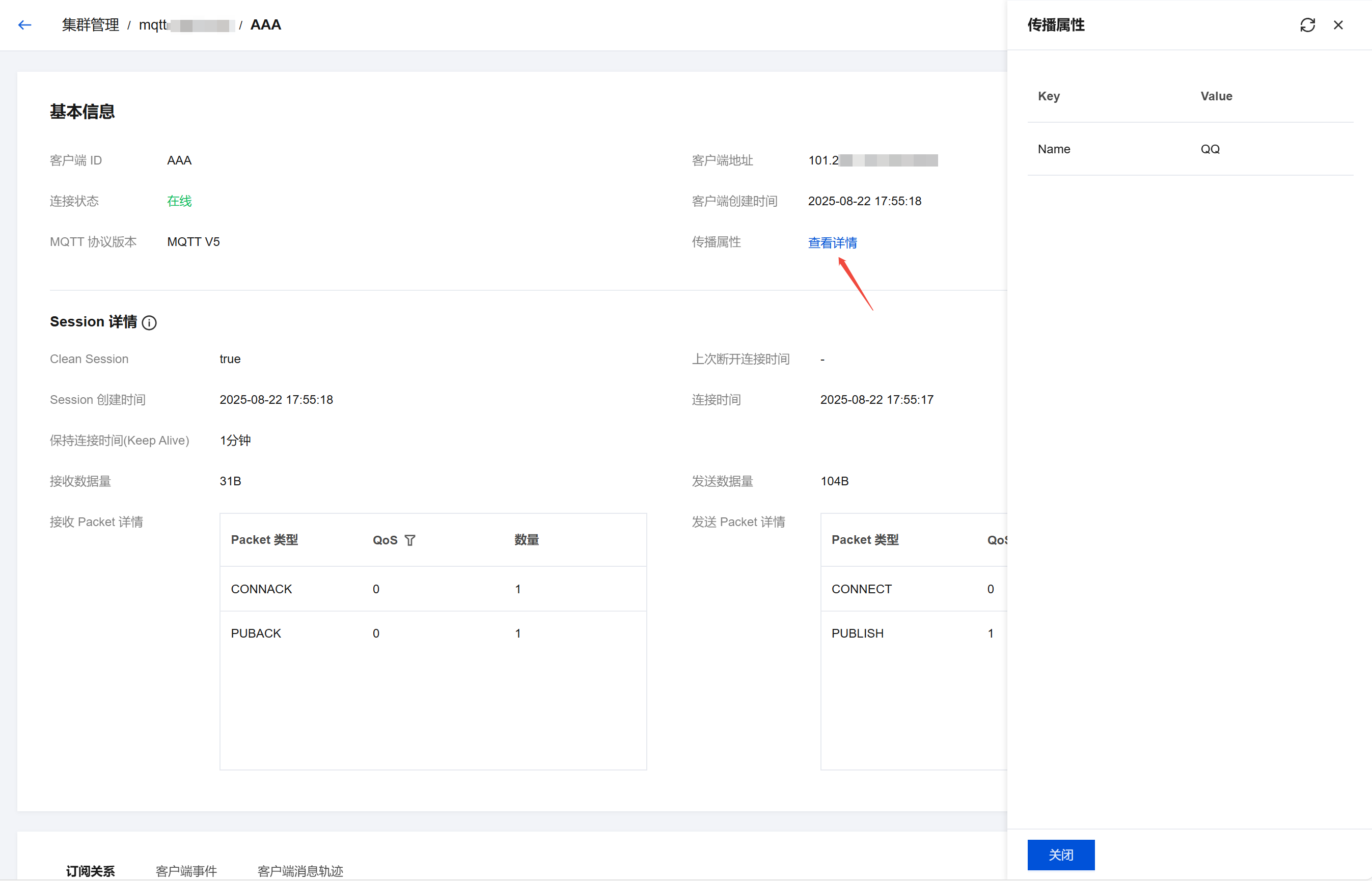 1. 登录消息队列 MQTT 版控制台。点击 资源管理 > 集群管理 > 客户端名称,查看具体客户端详情。