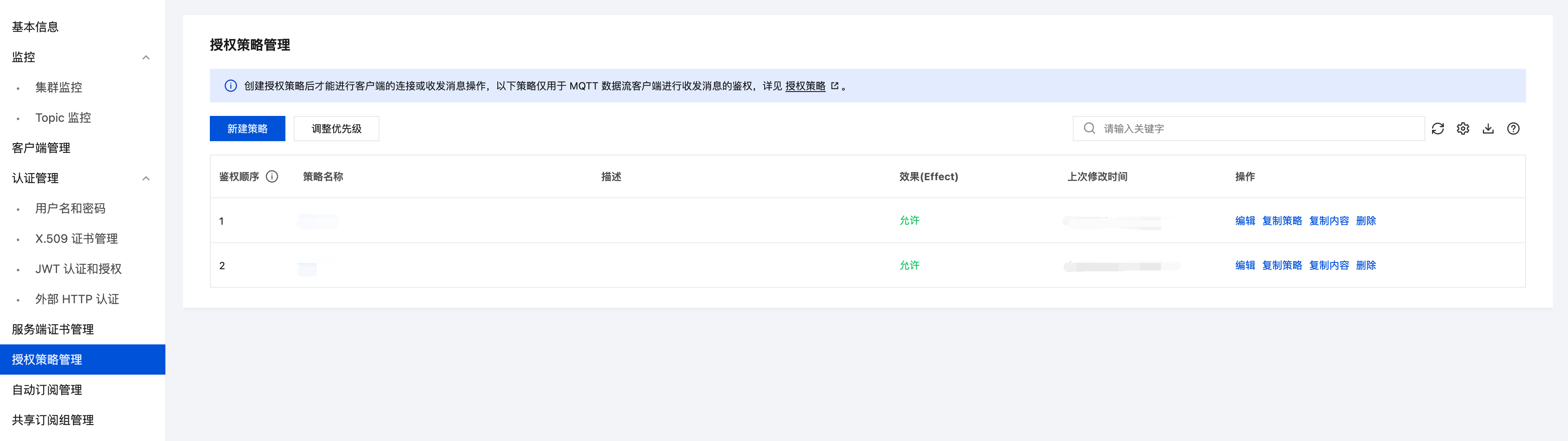 若您开启了授权策略管理,则需要为创建好的用户设置生产消息和消费消息的权限,详情见 数据面授权策略说明。