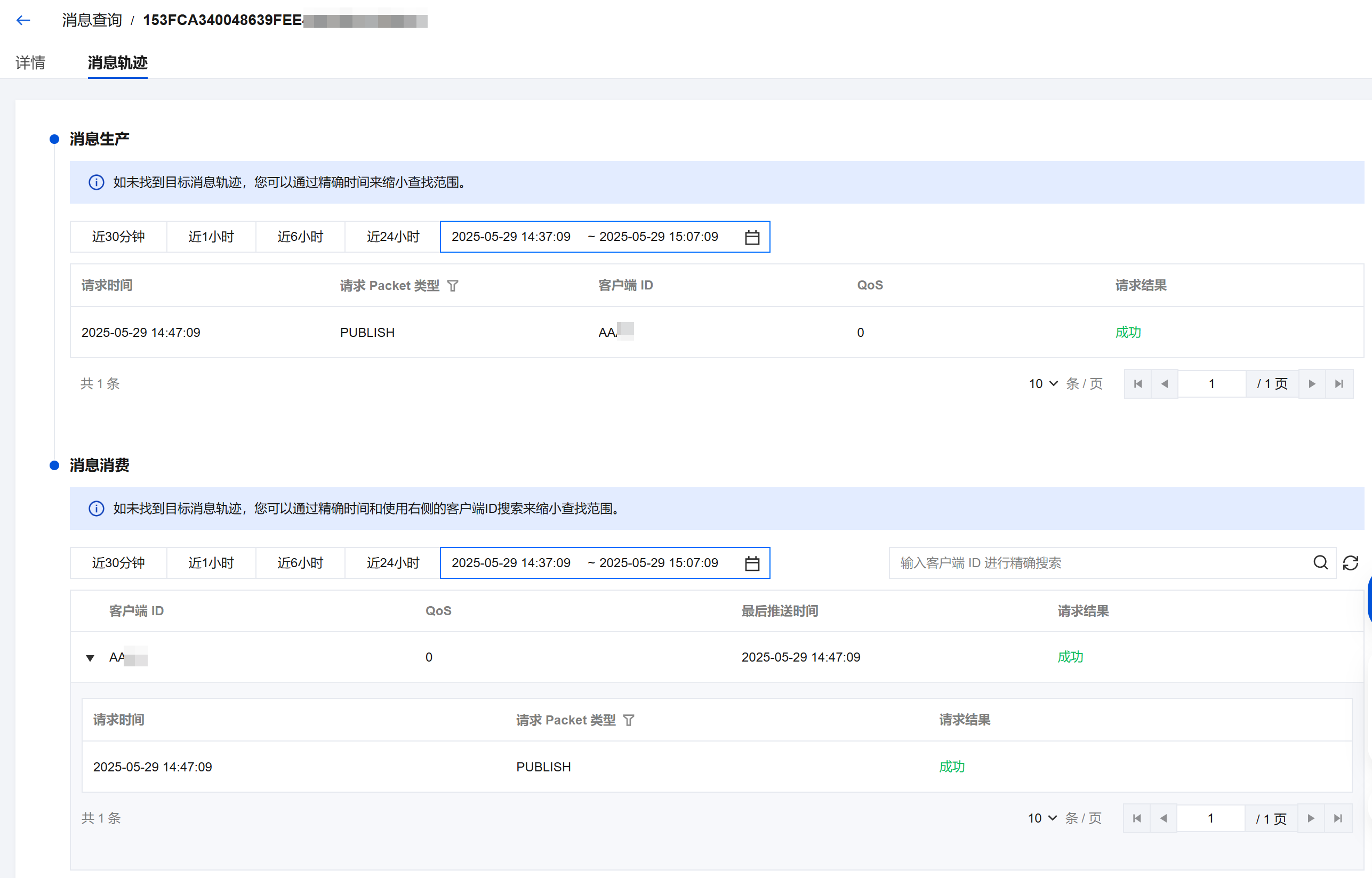 点击客户端 ID 下方的右三角,可以查看服务端推送此消息的请求详情。