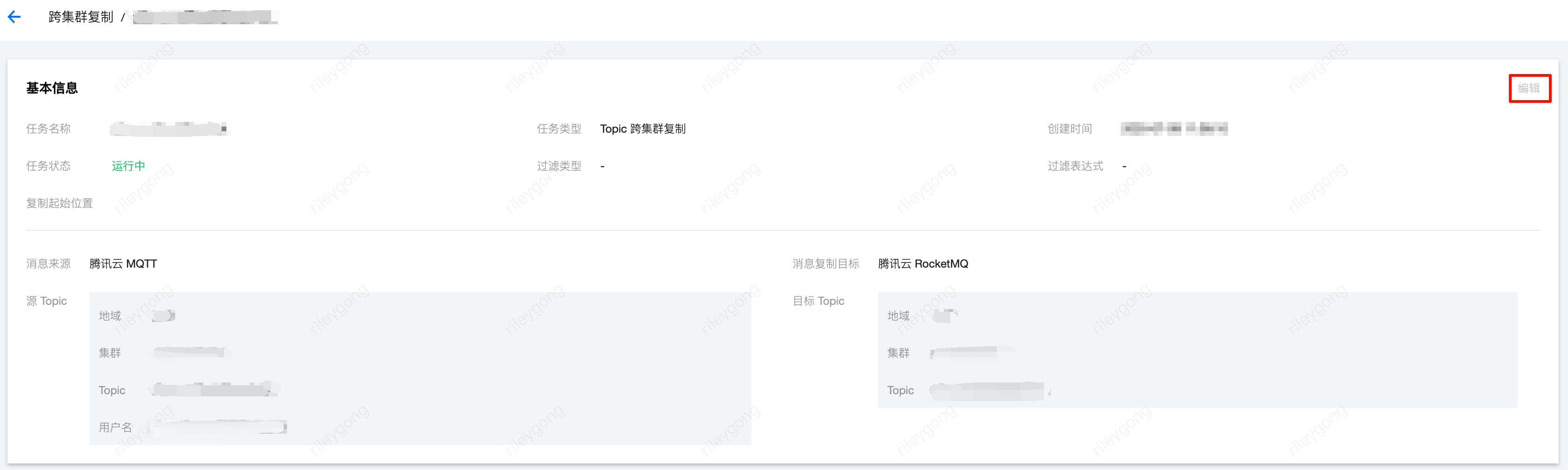 2. 您可以单击任务名称,进入任务详情页查看任务的详细配置。运行中的任务不能修改配置信息,如果要修改复制任务的配置,请先暂停任务后,单击操作栏的编辑,或者进入任务详情页,单击“基本信息”右上角的编辑,修改任务的信息。