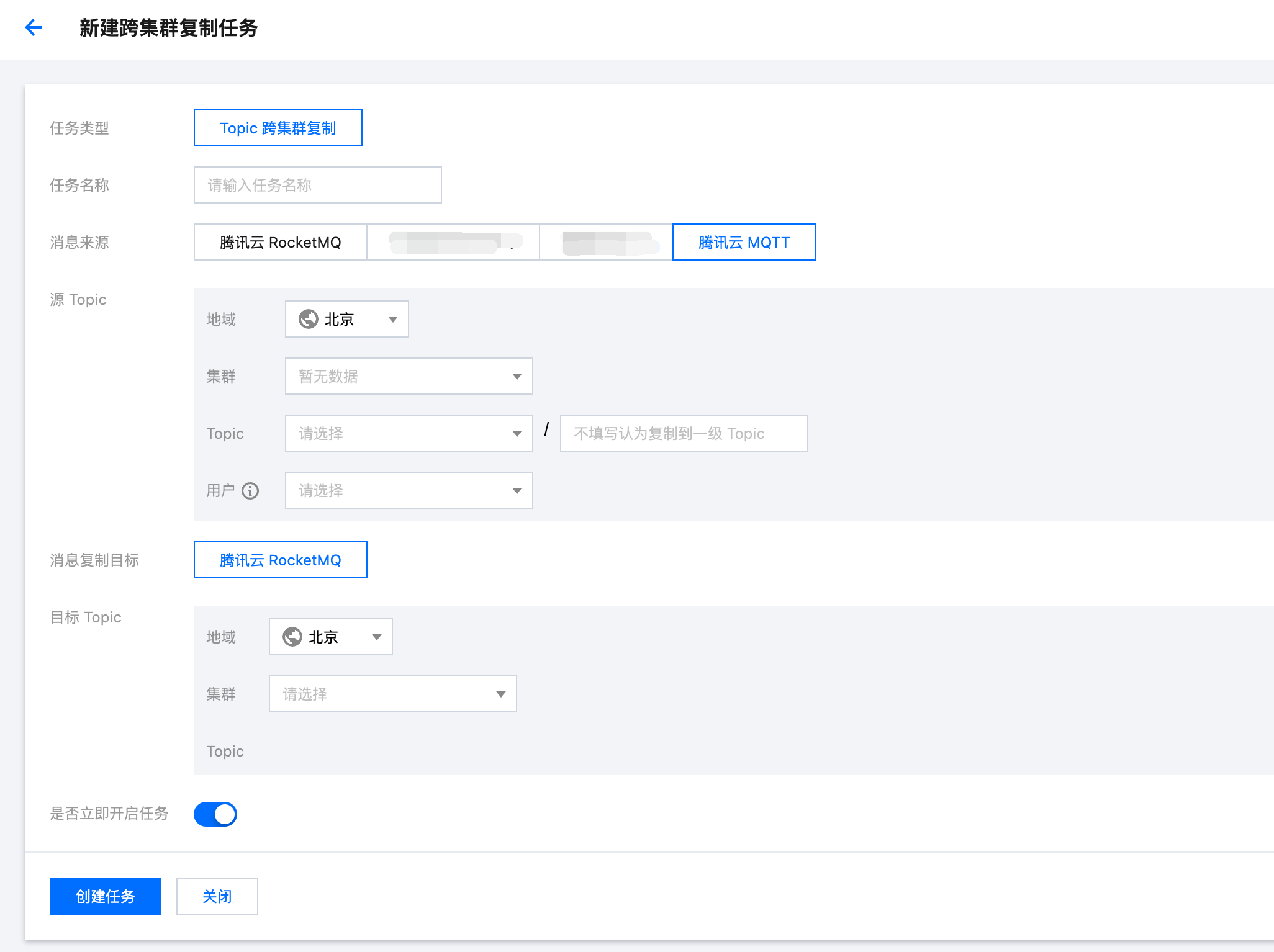 目标 Topic:通过下拉依次选择地域、集群、和 Topic,如果没有合适的集群或 Topic 可以在集群列表页进行新建。