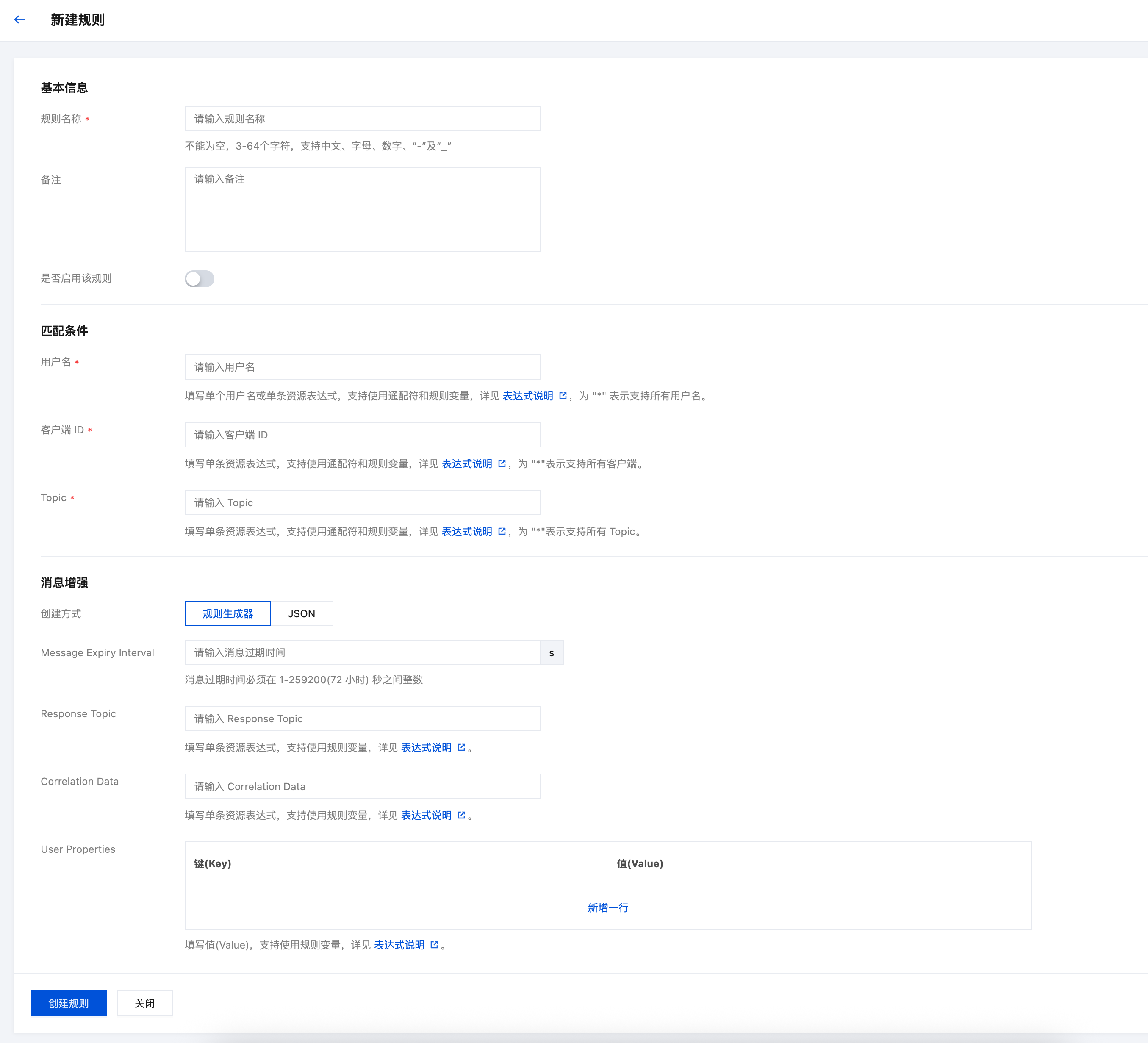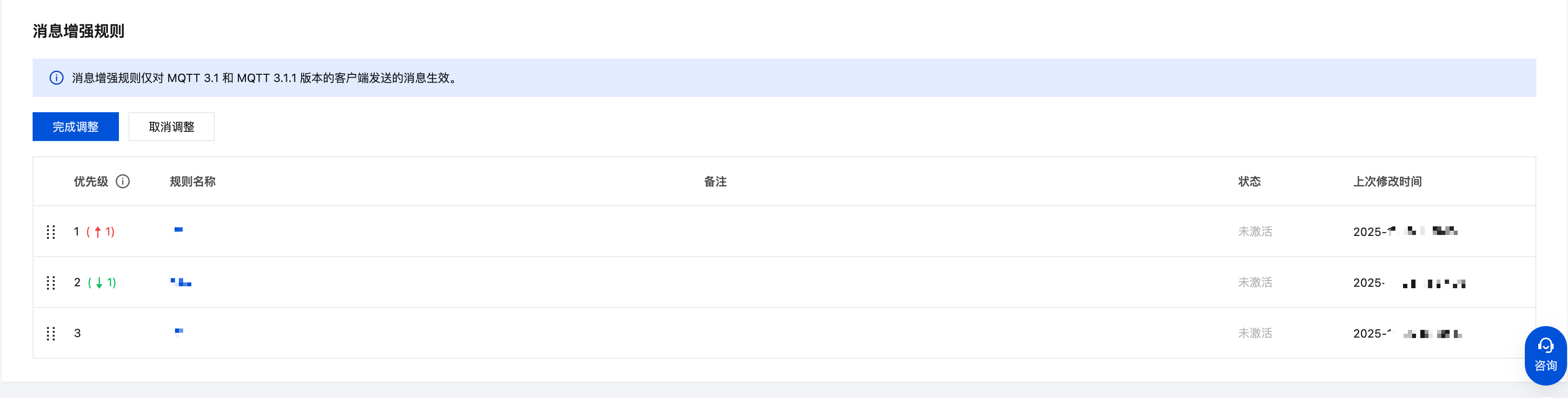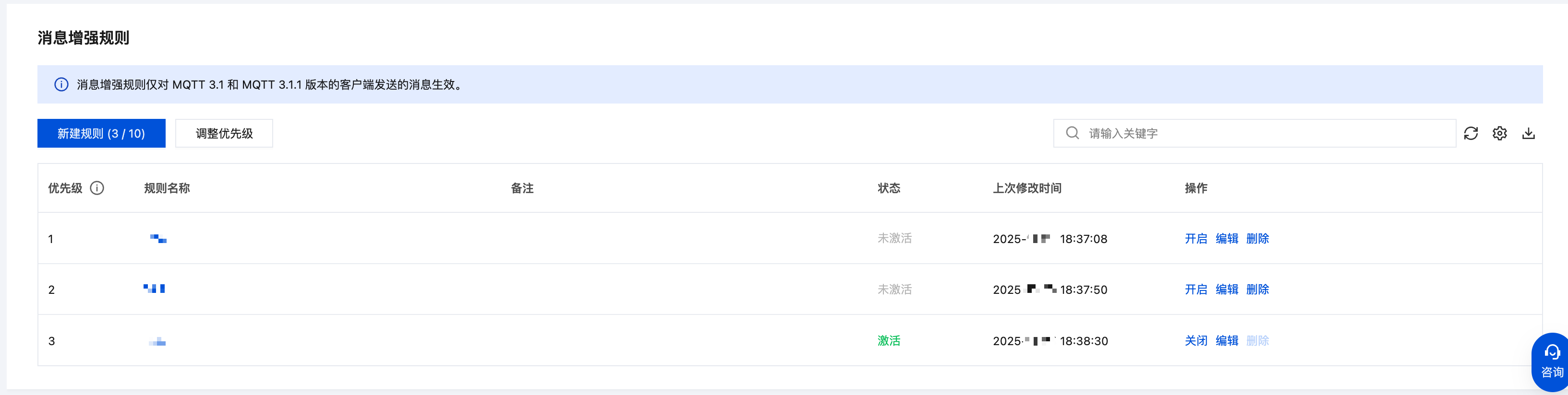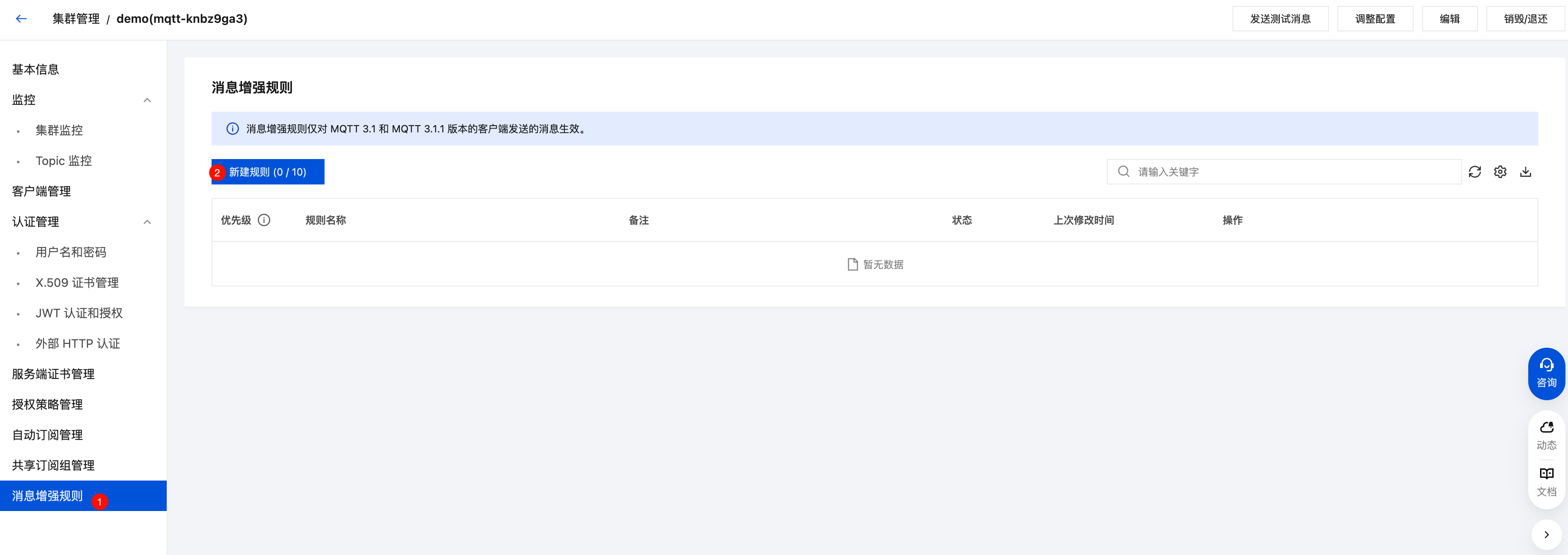 每个集群最多支持10条消息增强规则,如有更多配额需求,请联系我们。