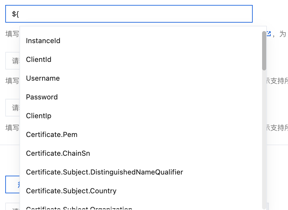 客户端 ID | clientId | 填写单条资源表达式,支持使用通配符和规则变量,为 "*"表示支持所有客户端。 | 是 | "sensor*" |