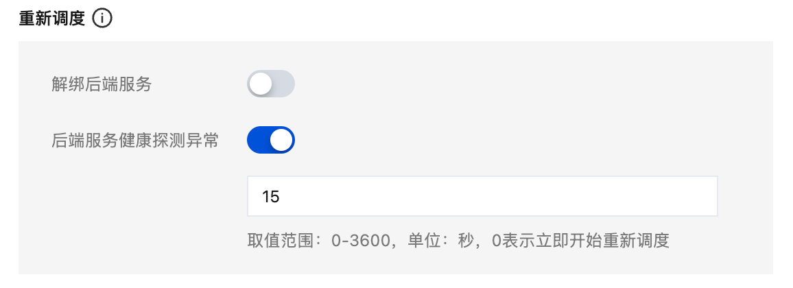 | 是 | 在设置的时间内,继续转发至健康探测异常的后端服务上。 超过设置的时间后,主动断开存量连接,从而将存量连接重新调度到其他正常的后端服务器。 0表示立即开始断开存量连接。 |