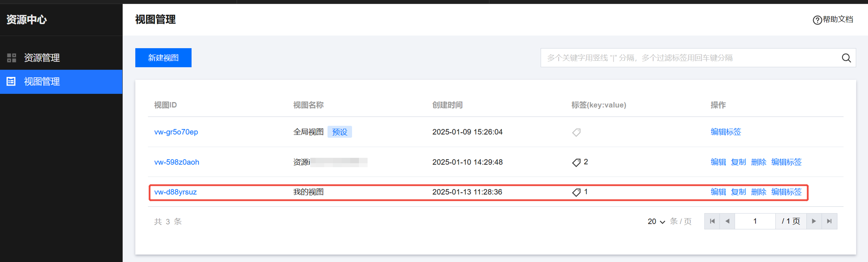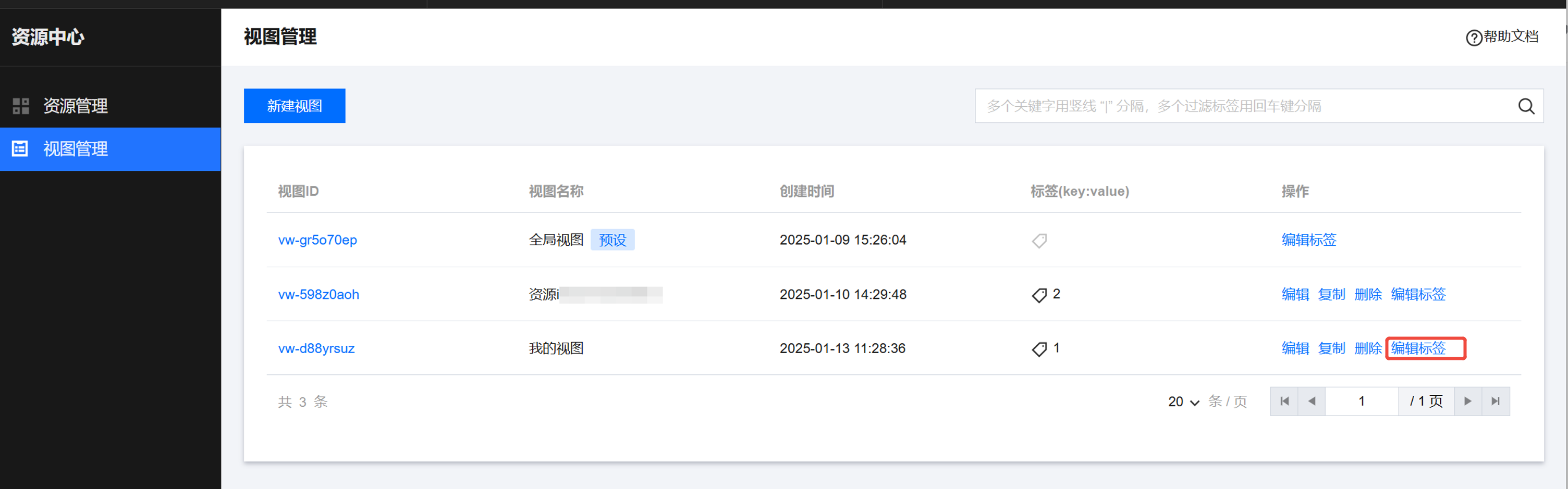 1. 在视图管理页面,单击视图列表右侧的编辑标签,编辑对应视图的标签。