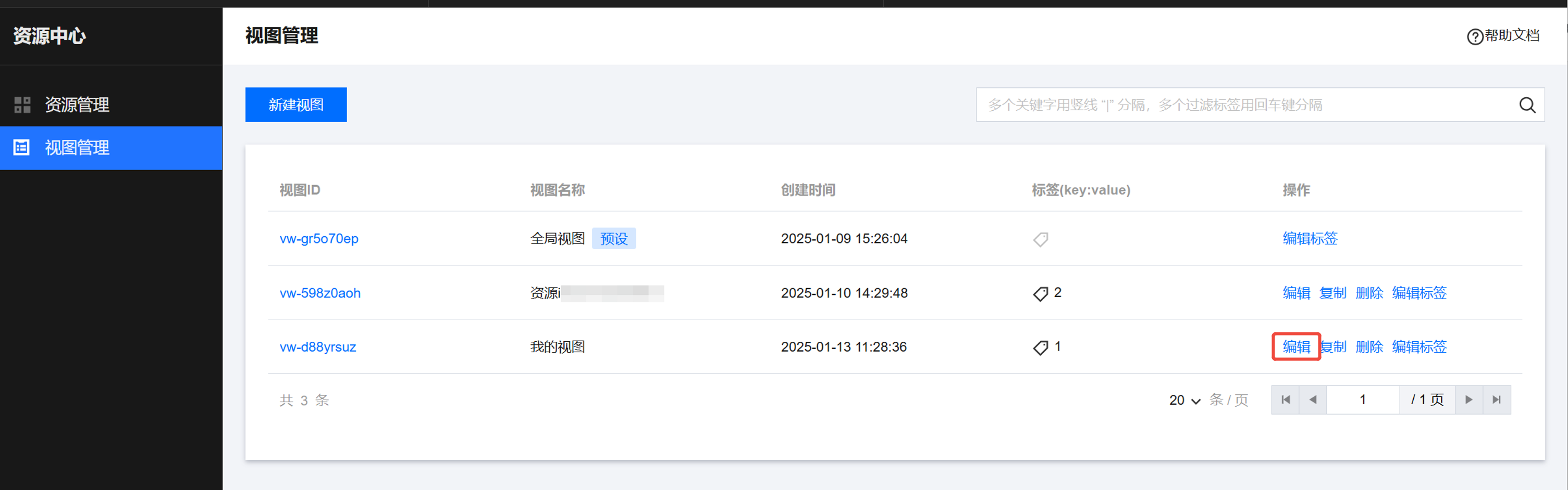 1. 在视图管理页面,单击视图列表右侧的编辑,编辑对应的视图。
