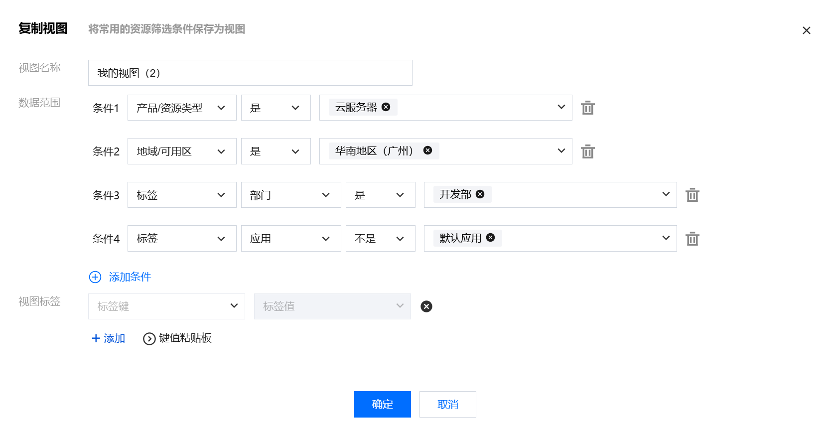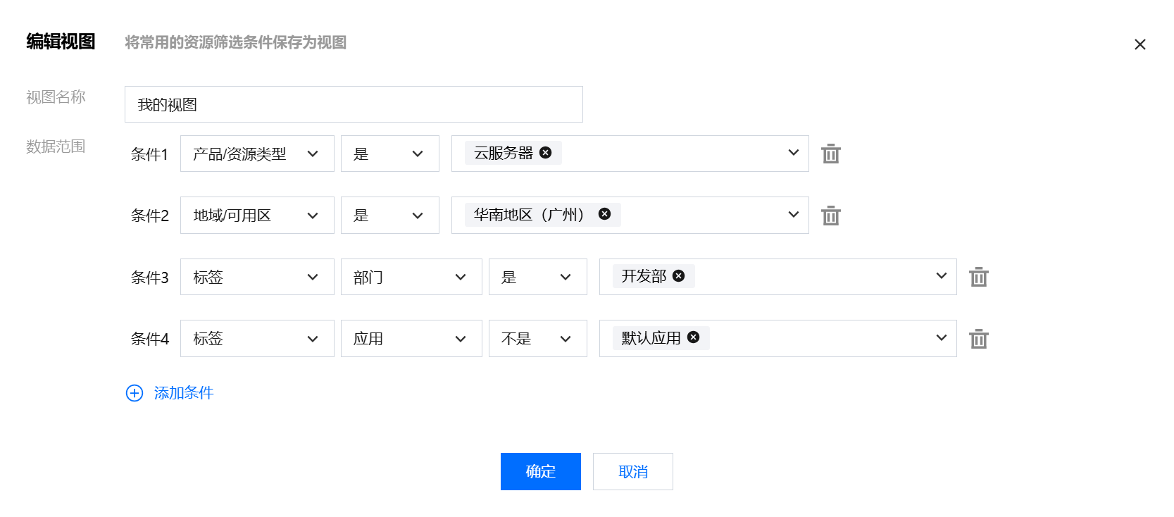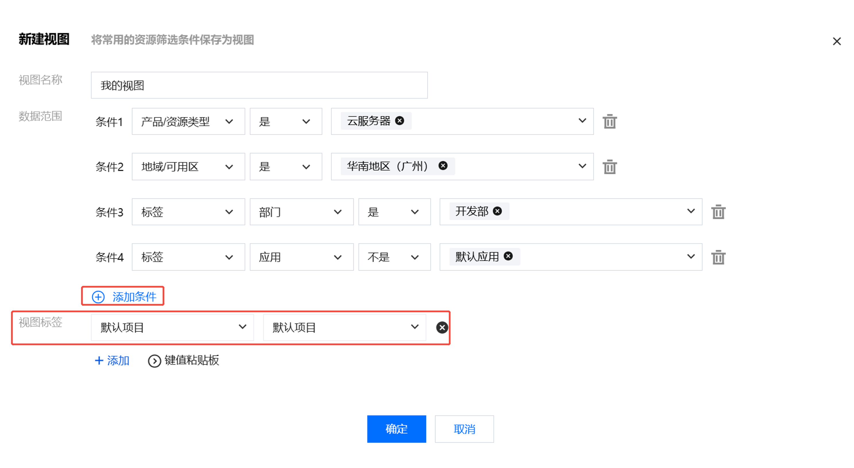2. 在弹出的窗口里,输入视图名称,单击下方添加条件,选择所需条件并输入数值。您也可以为视图绑定标签,方便后续在控制台标签页面查找视图或者在 CAM 里按照标签为视图配置子用户访问策略。