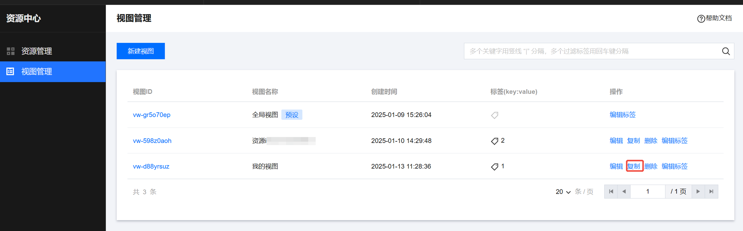 1. 在视图管理页面,单击视图列表右侧的复制,复制对应的视图。
