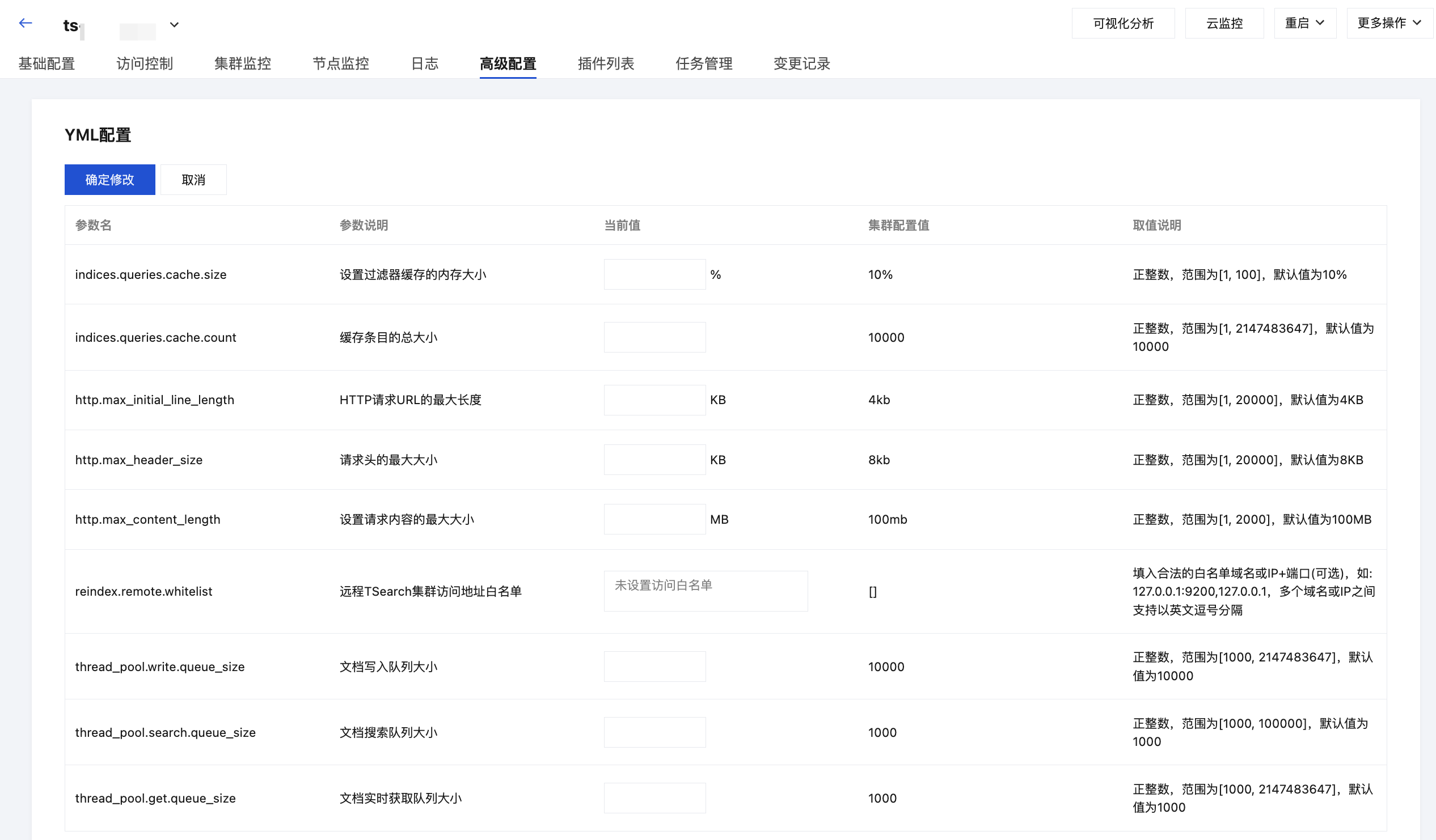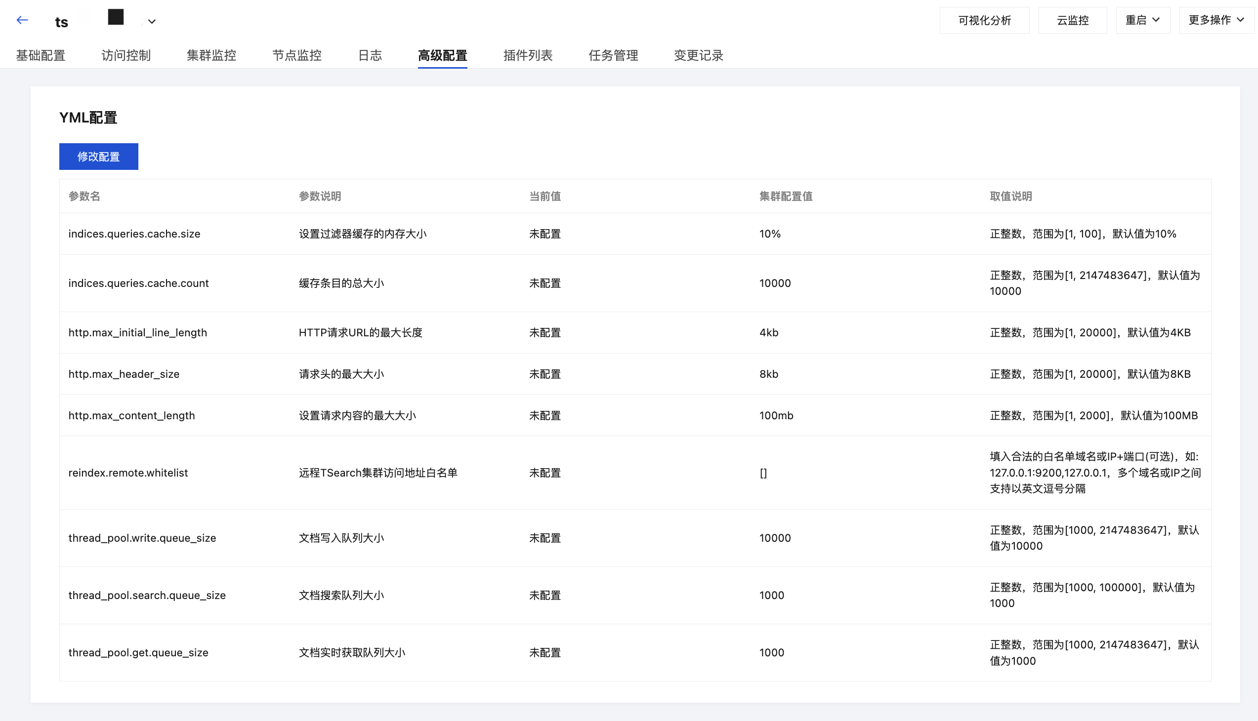 1. 您可以通过修改腾讯云检索分析服务 TSearch 实例的 YML 参数配置,配置常用的参数。