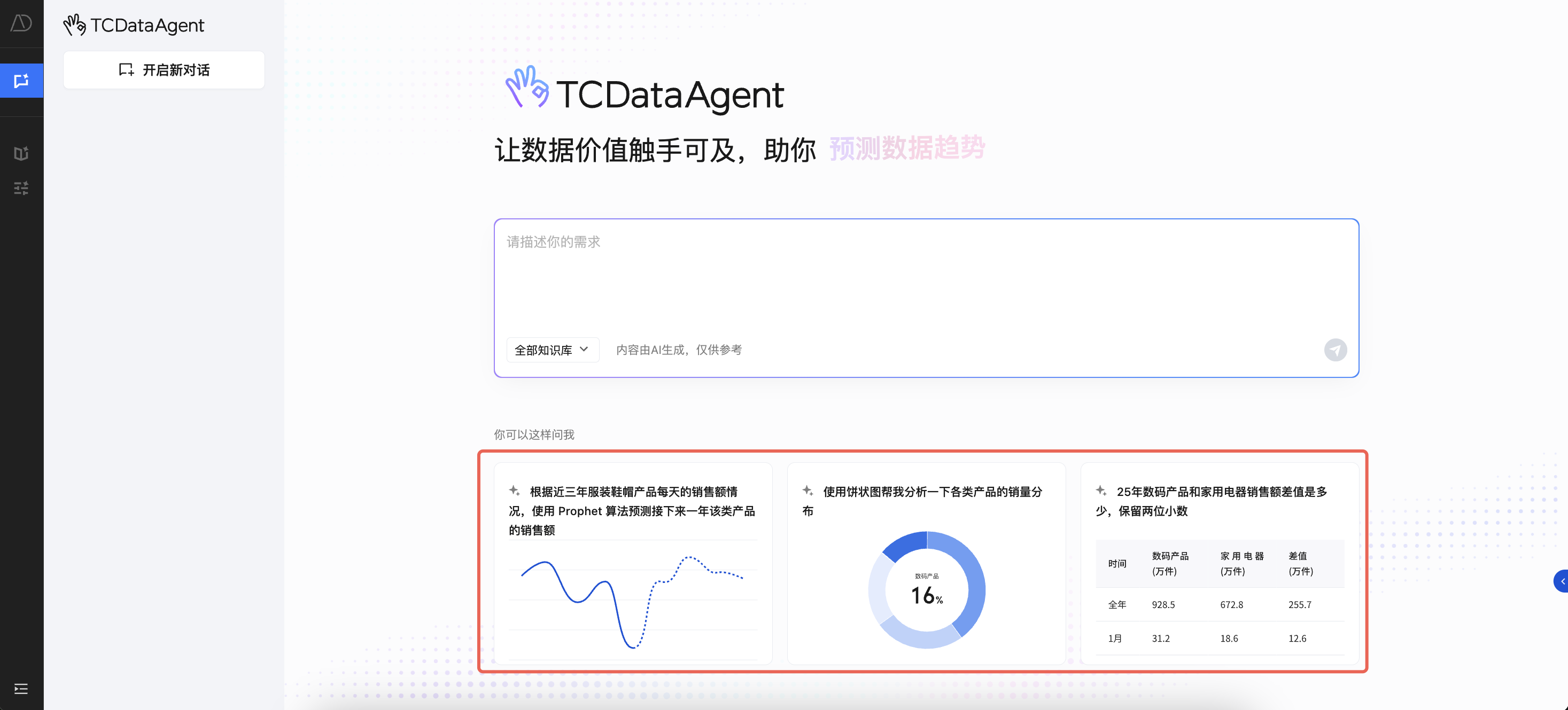 TCDataAgent 内置了官方样例数据和问题。您可以直接点击示例问题进行体验。