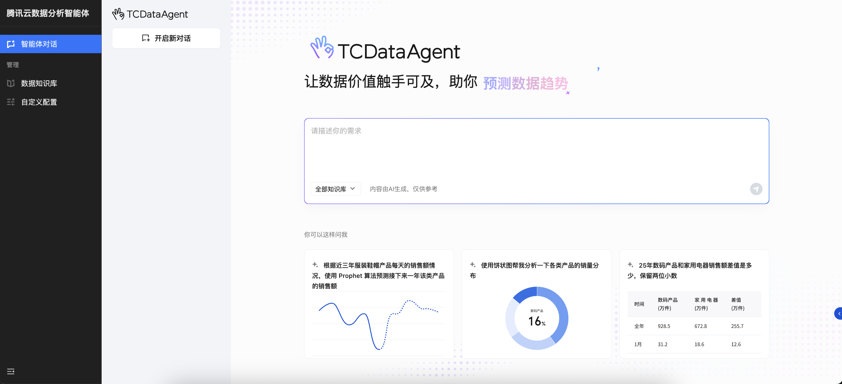 TCDataAgent 提供面向企业数据自主分析与洞察的智能体服务。您可通过本文档快速体验产品功能。