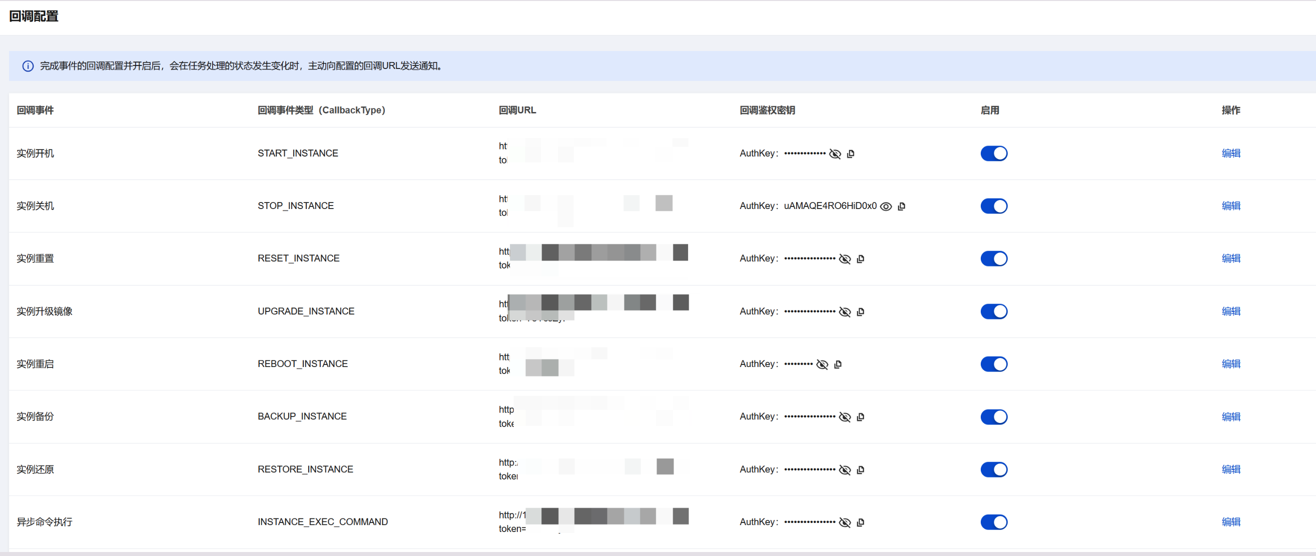 3. 单击确定保存回调信息后,可以在回调事件列表中启用对应的事件。如需关闭回调事件通知,可修改启用状态。
