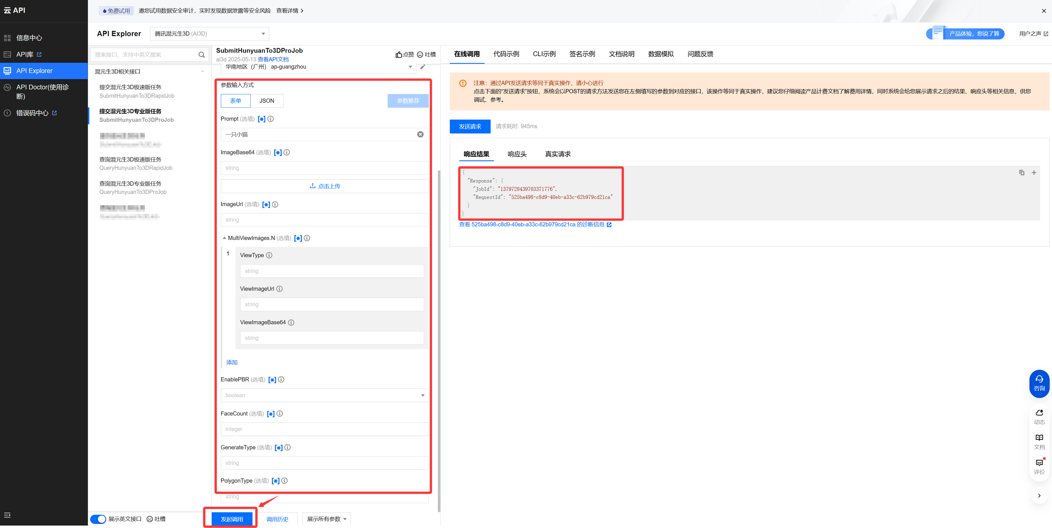 调用提交混元生3D 专业版任务接口:输入参数之后点击发起调用,会返回提交混元生3D 专业版任务的结果信息。