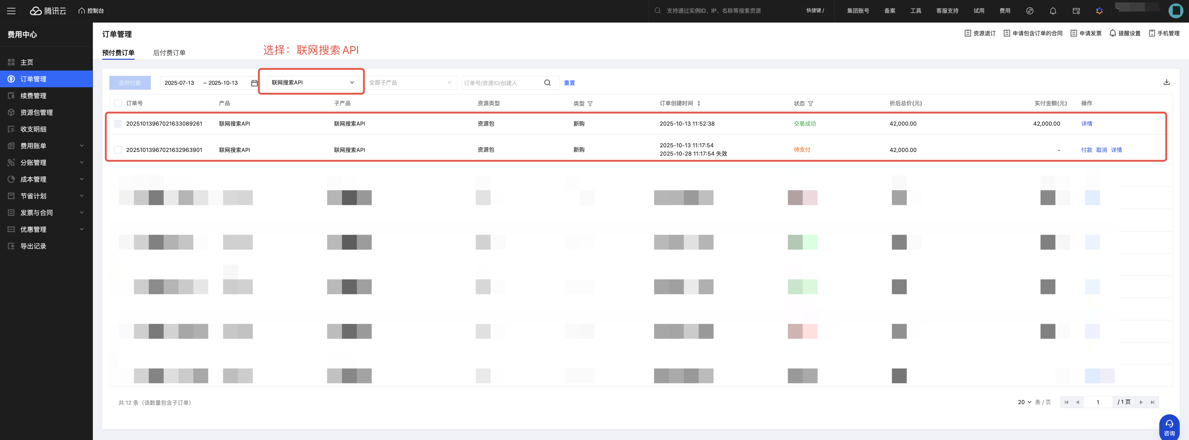 2. 在订单管理页面,单击预付费订单页签,下拉产品选择框并选择联网搜索API 产品,查看购买资源包的订单记录: