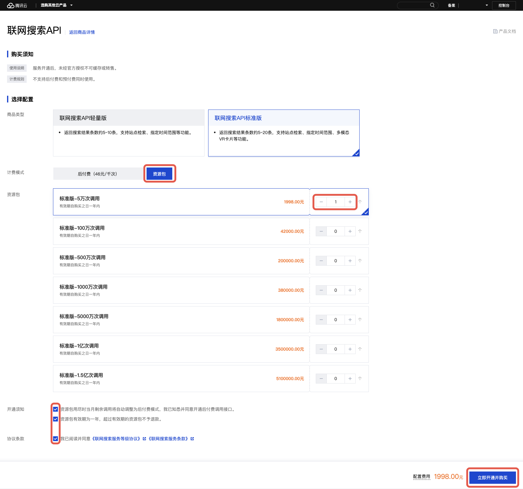 企业用户:企业实名认证用户支持购买联网搜索API 标准版资源包或尊享版资源包。