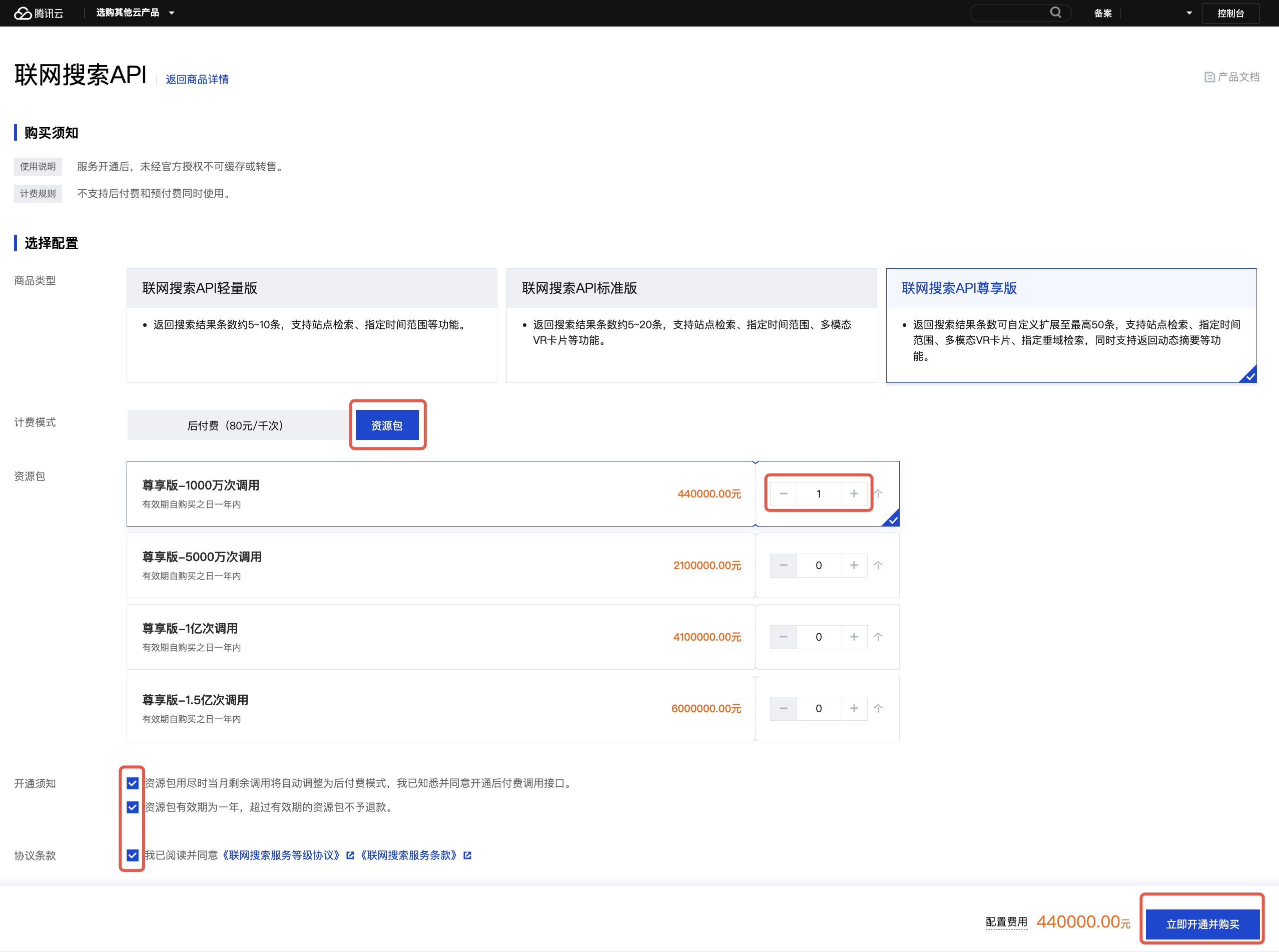 2. 根据您的实际业务需求选择商品类型,计费模式选择资源包,选择所需规格的资源包及购买数量,阅读并同意开通须知和协议条款,勾选成功后,单击右下角的立即开通并购买。