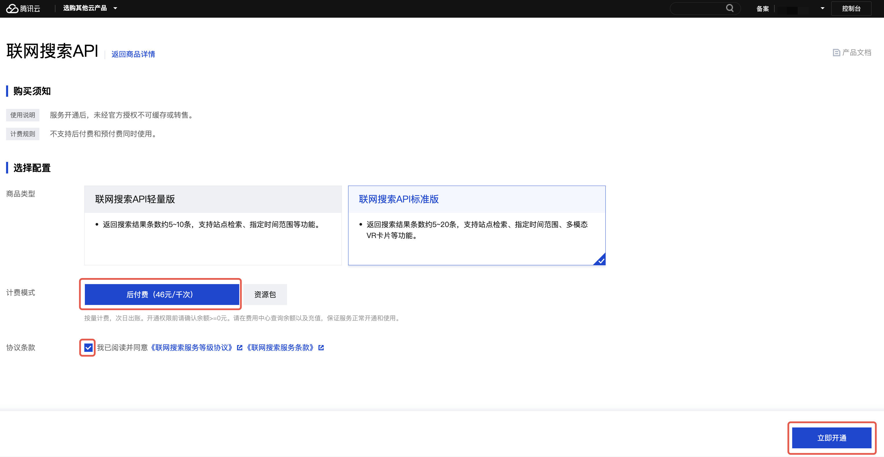 2. 根据您的实际业务需求选择商品类型,计费模式选择后付费,阅读并同意协议条款,勾选成功后,单击右下角立即开通。