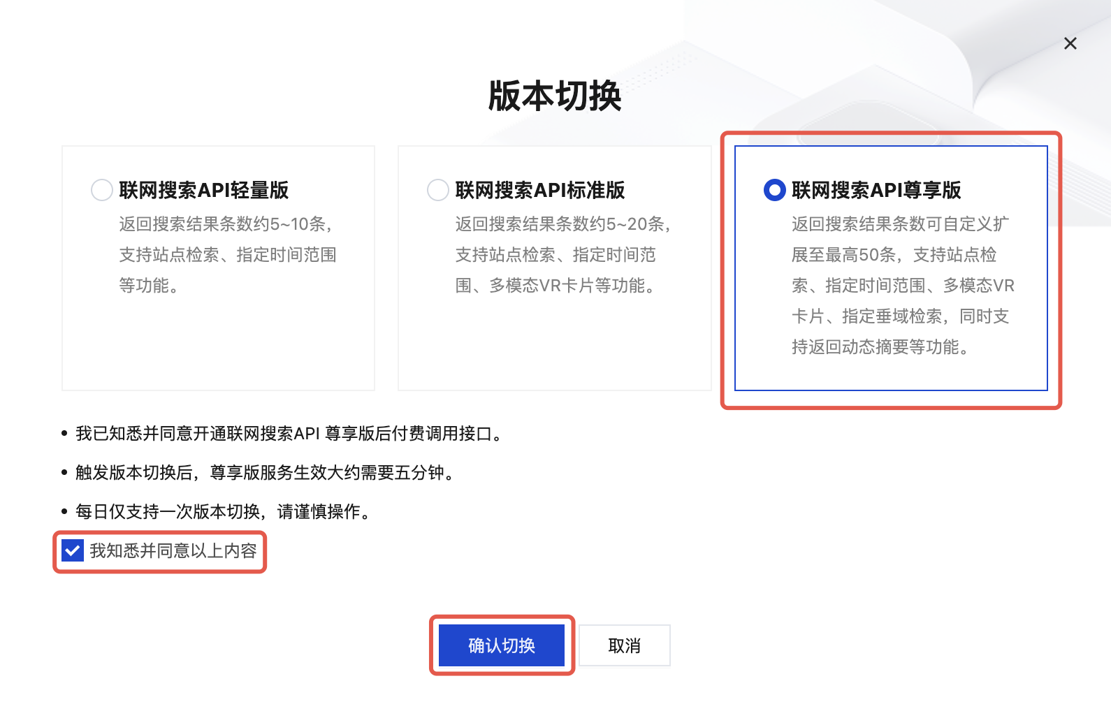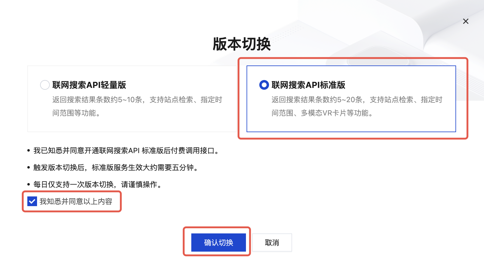 3. 根据您的业务需求选择目标服务版本,阅读并同意上方条款,勾选成功后,单击确认切换。