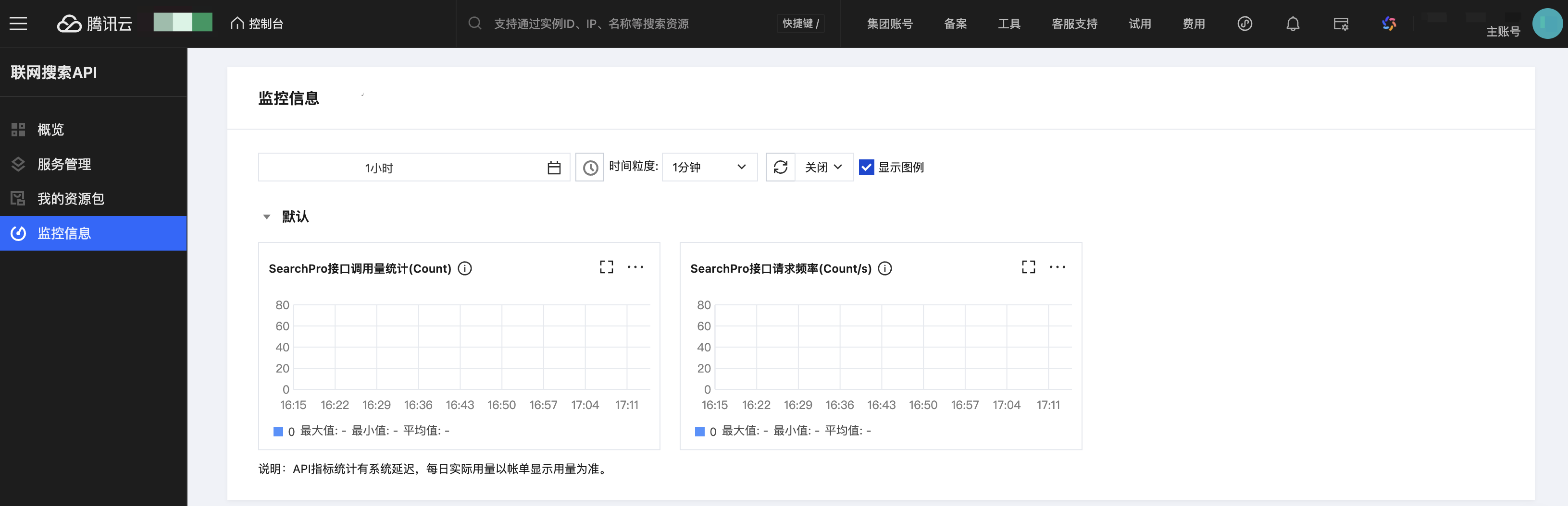 1. 若您使用主账号登录联网搜索API 控制台,则可按照 操作步骤 指引查看监控信息。