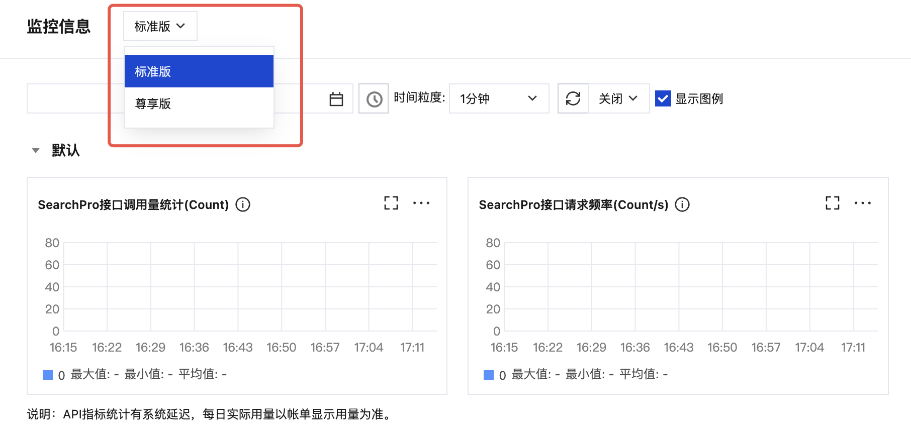4. 若您为企业用户,且使用过联网搜索API 不同版本(标准版/尊享版)的服务,则可单击版本选择框(仅企业用户展示),查看不同版本下的监控信息。