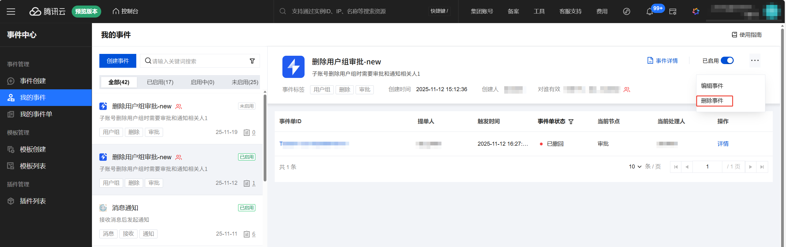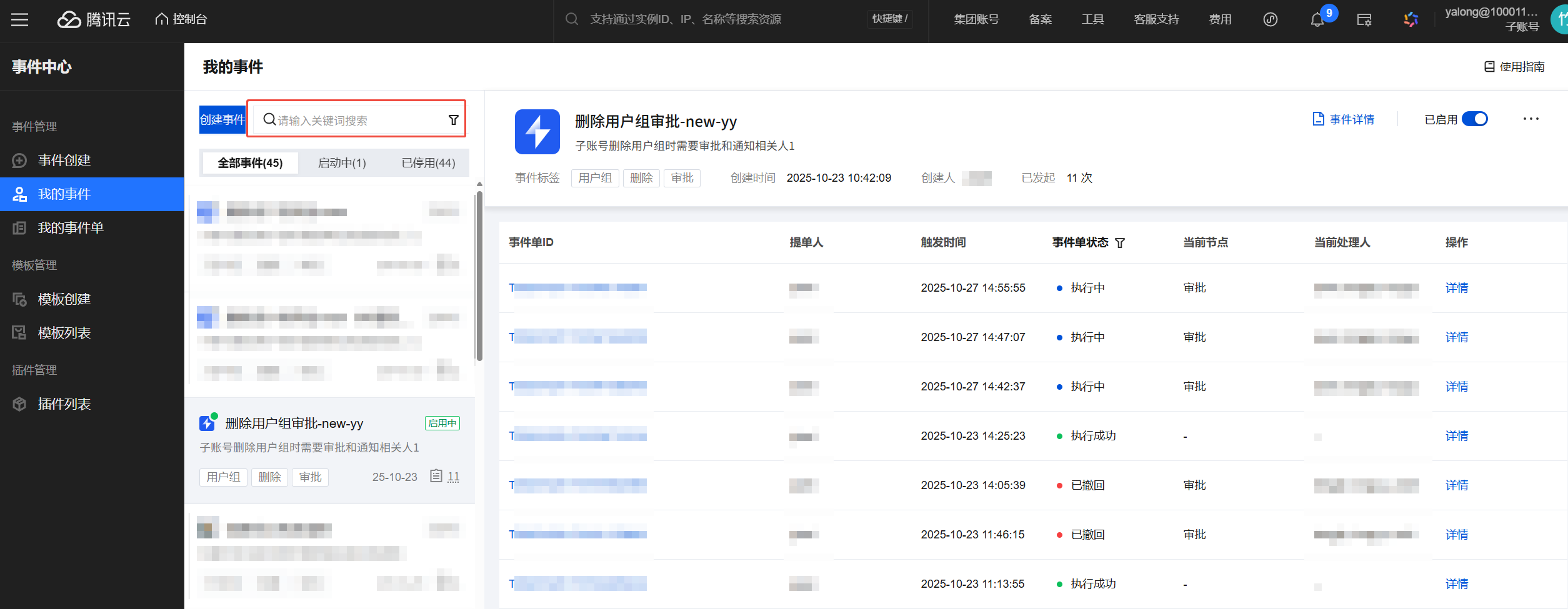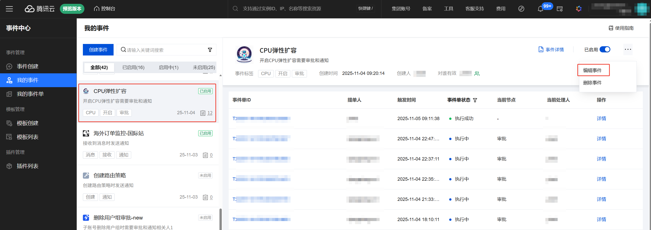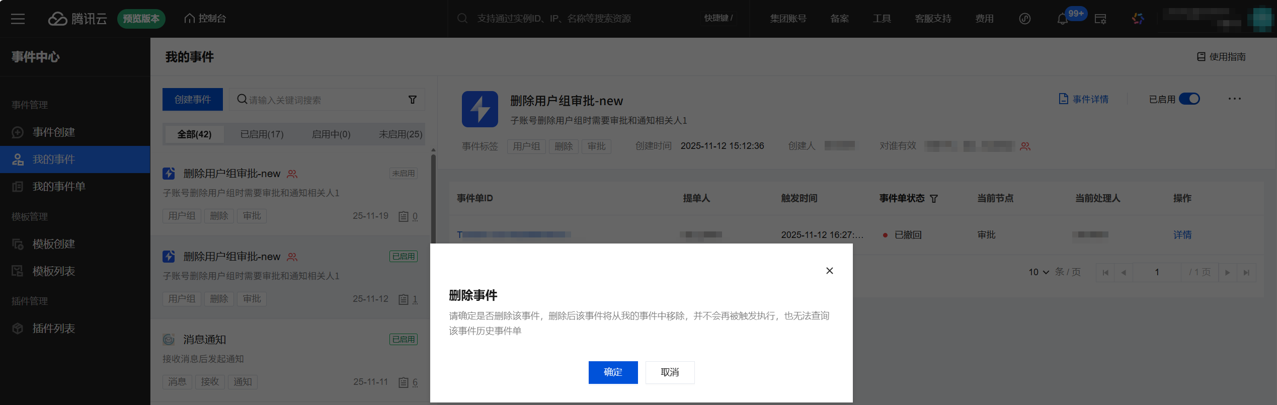 事件删除后,该事件将从我的事件中移除,并不会再被触发执行,也无法查询该事件的历史事件单,请谨慎操作。