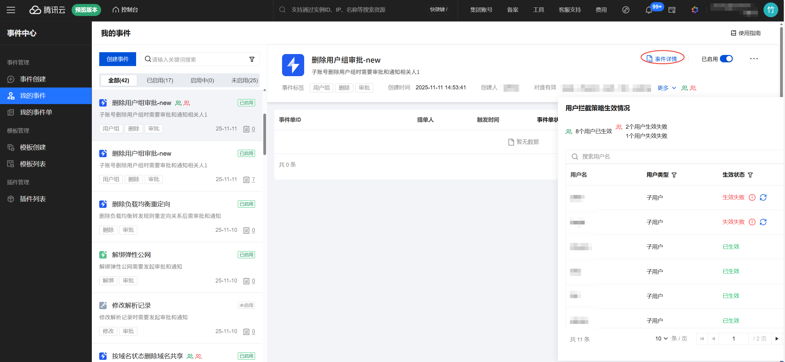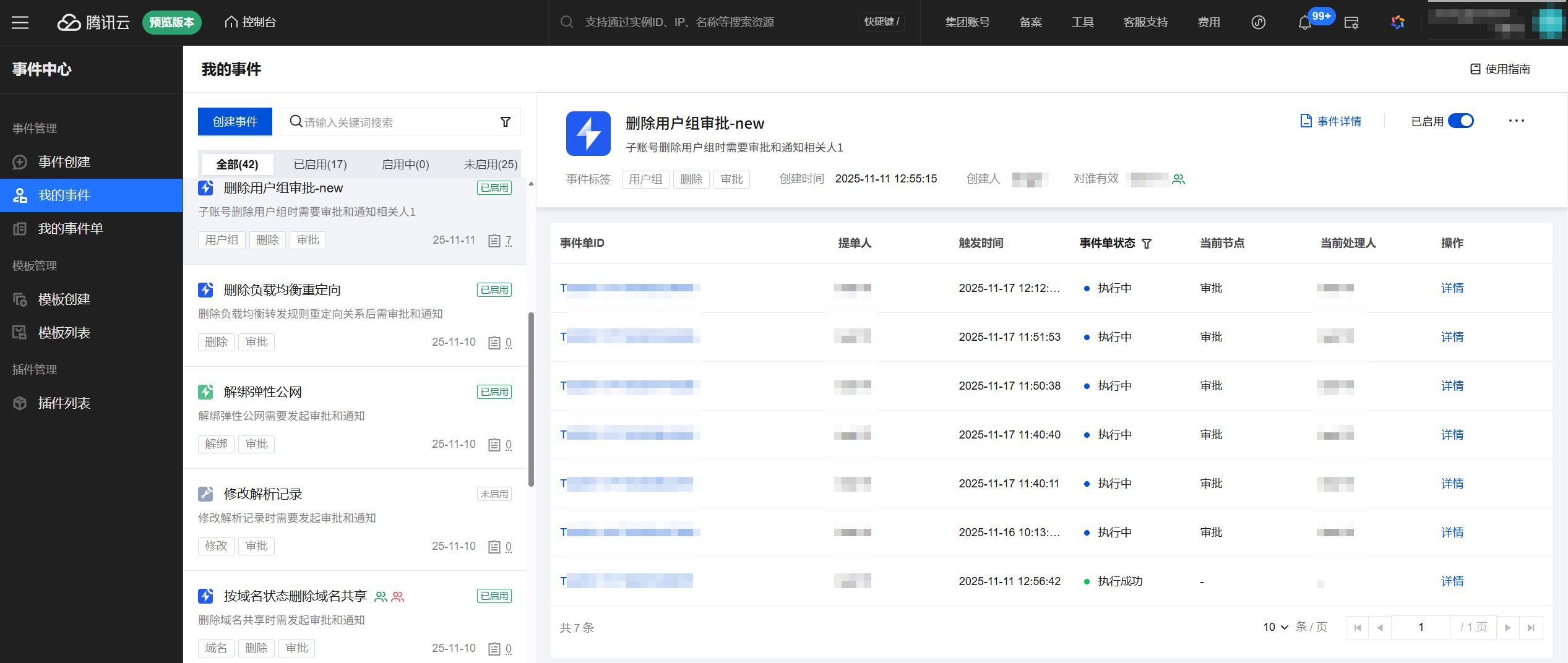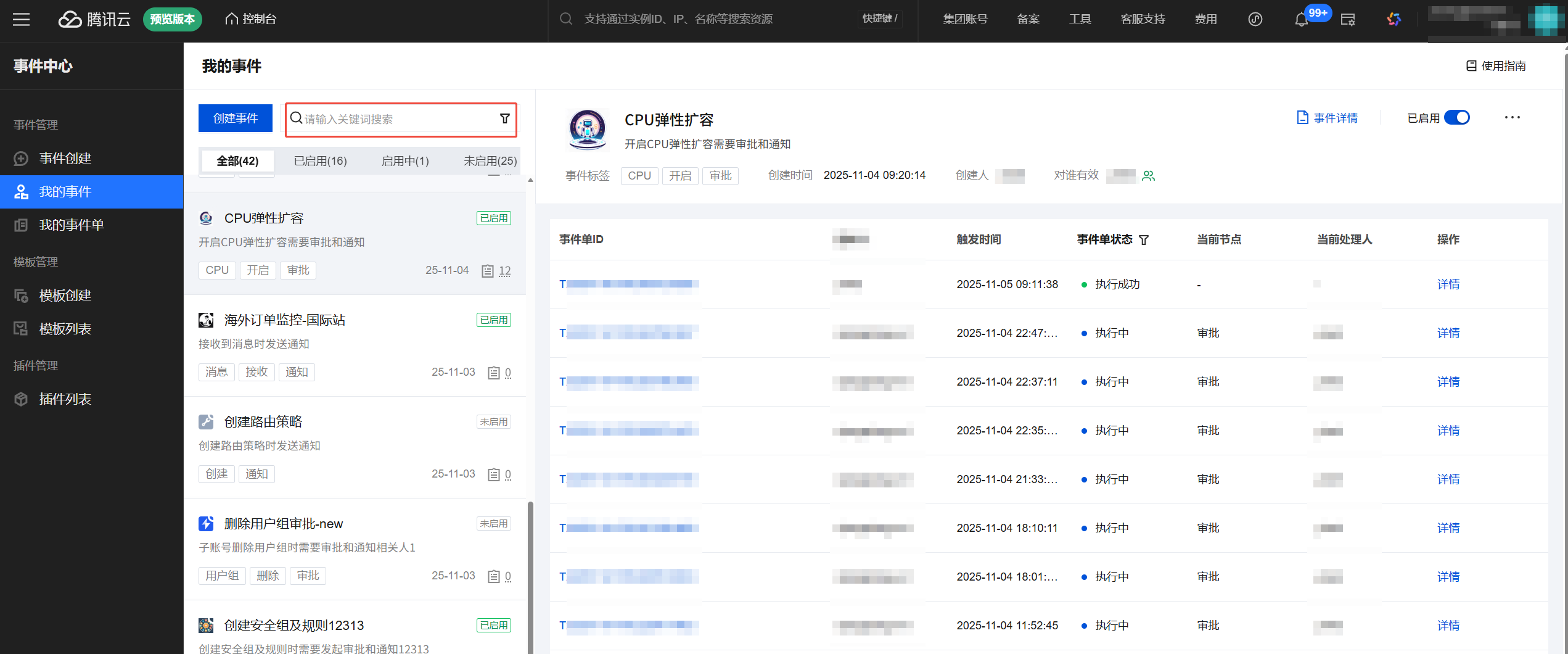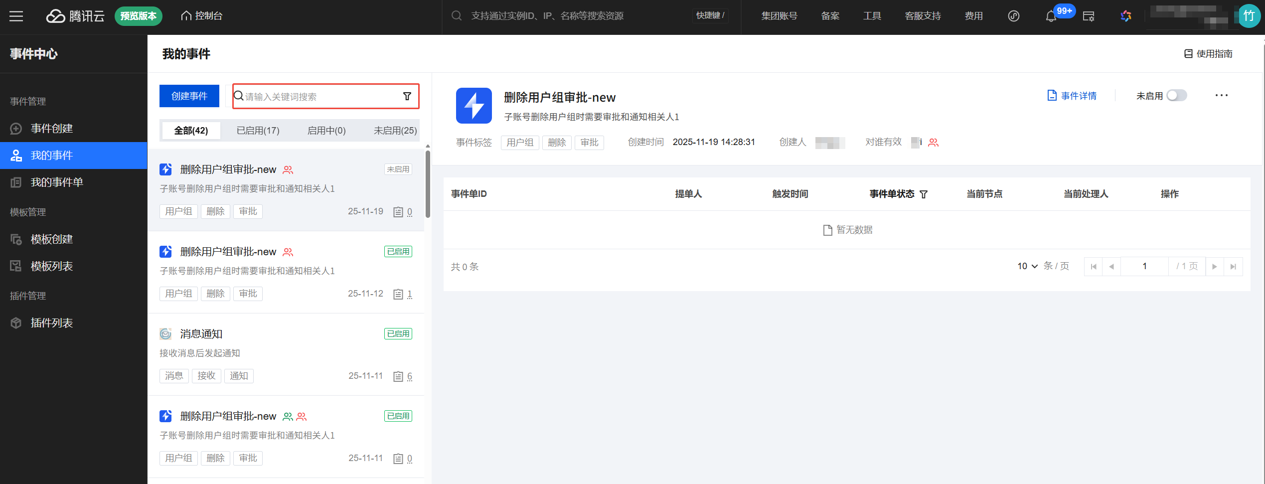 事件删除后,该事件将从我的事件中移除,并不会再被触发执行,也无法查询该事件的历史事件单,请谨慎操作。