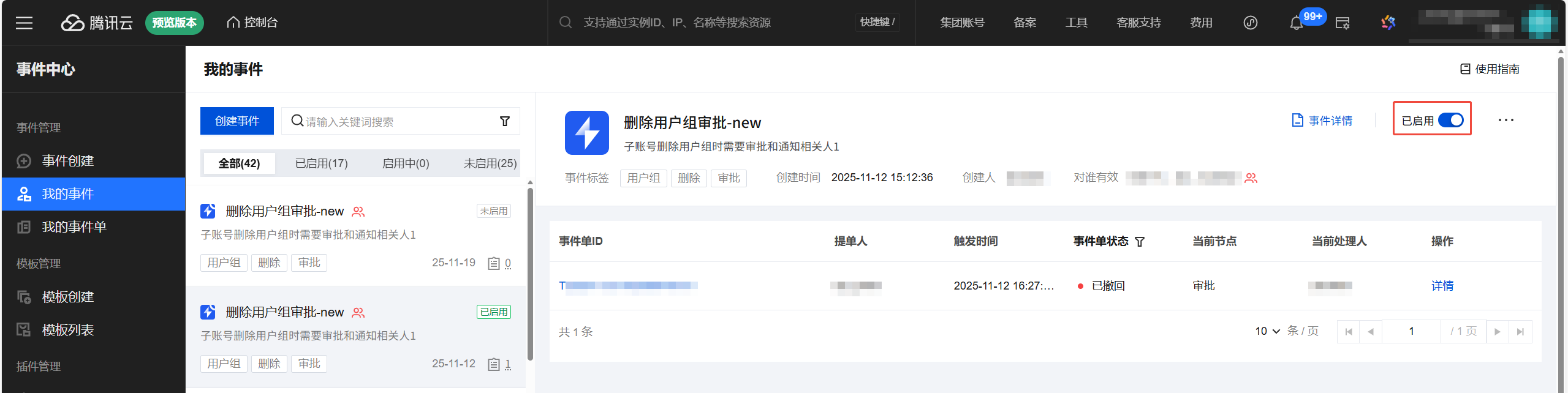 3. 选中事件后,单击事件卡片右上方的「已启用」/「已停用」开关按钮,即可启用/停用事件,被停用的事件,后续将无法再发起此事件的事件单。