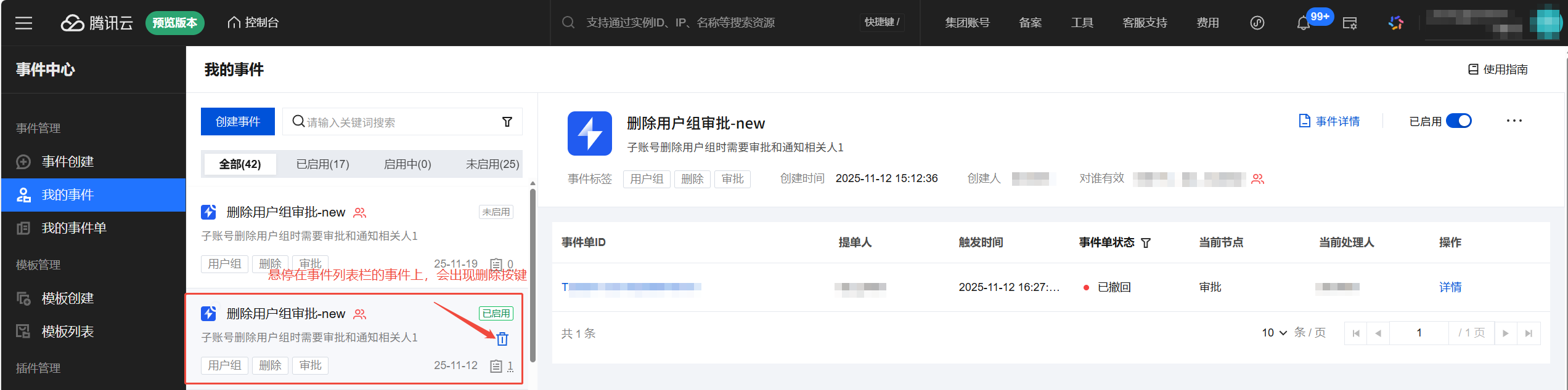 2.2 在事件单列表中删除,在“我的事件”页面,事件列表中,找到具体的事件,鼠标悬停在事件区域,会出现一个删除图标,点击后即可删除该事件;