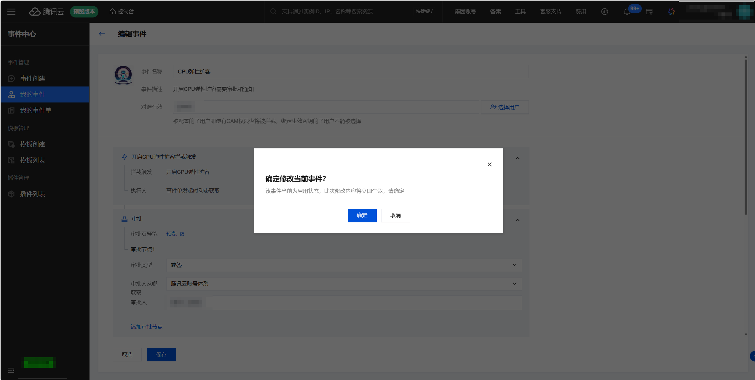 2. 选择需变更的事件:支持通过选择模板分类标签筛选,或输入事件名称/事件编码关键词模糊匹配搜索。