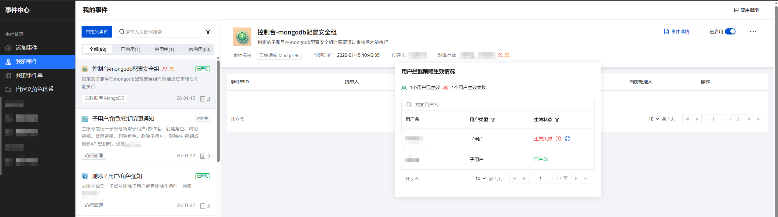 关于事件状态说明:创建事件,如果是拦截类场景事件,需要选择对谁有效,启用事件时,系统会校验每个所选用户最终的生效状态并展示;若所有用户的生效状态均 = “生效失败”,则事件状态为“未启用”;若所有用户中有任意一个或多个用户生效状态 = “已生效”,则事件状态为“已启用”。对于已生效的用户在操作时会正常触发拦截并创建事件单,对于生效失败的用户则不会触发拦截