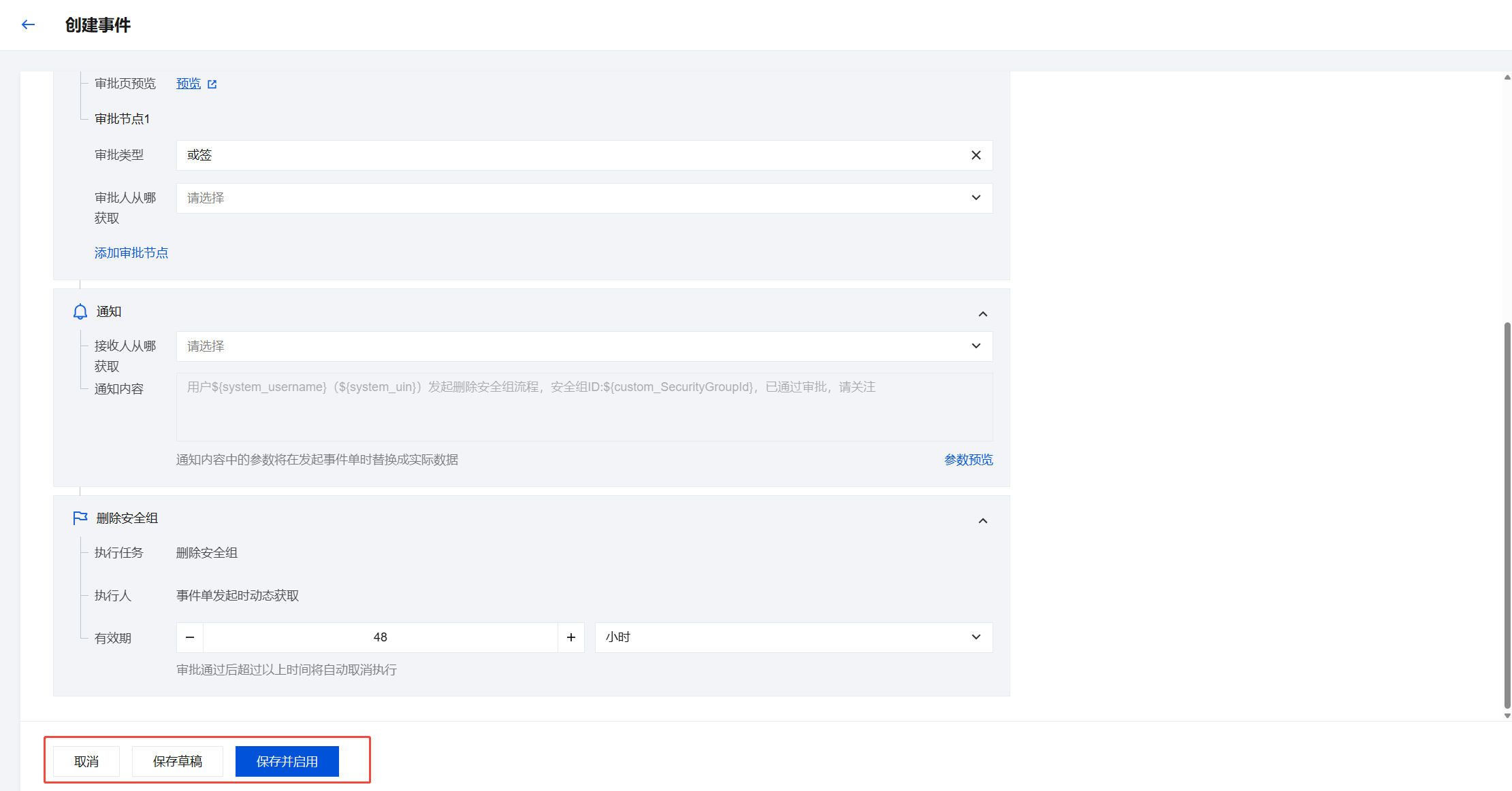 流程步骤:选择事件模板 > 创建事件 > 补充事件信息 > 保存并启用事件。