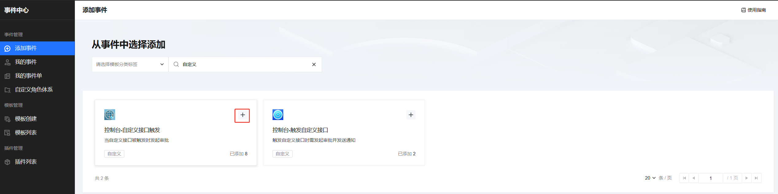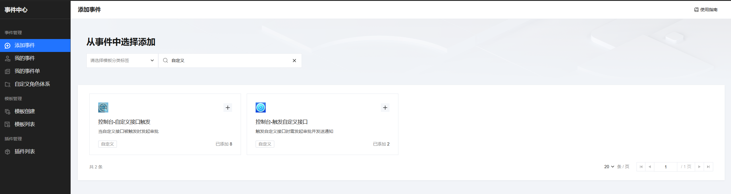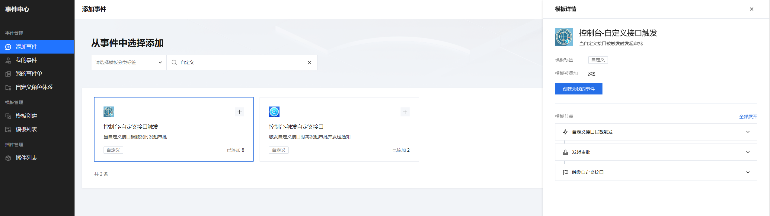 在事件创建页面,筛选栏,输入自定义关键词,或者从筛选栏标签栏中,搜索自定义标签,搜索到具体的模板“控制台-触发自定义接口”。目前提供了两个可适用多个操作场景的事件,事件1仅触发拦截并推送审批,审批通过后可操作执行;事件2触发拦截并推送审批,审批通过后定向通知相关人同时可操作执行